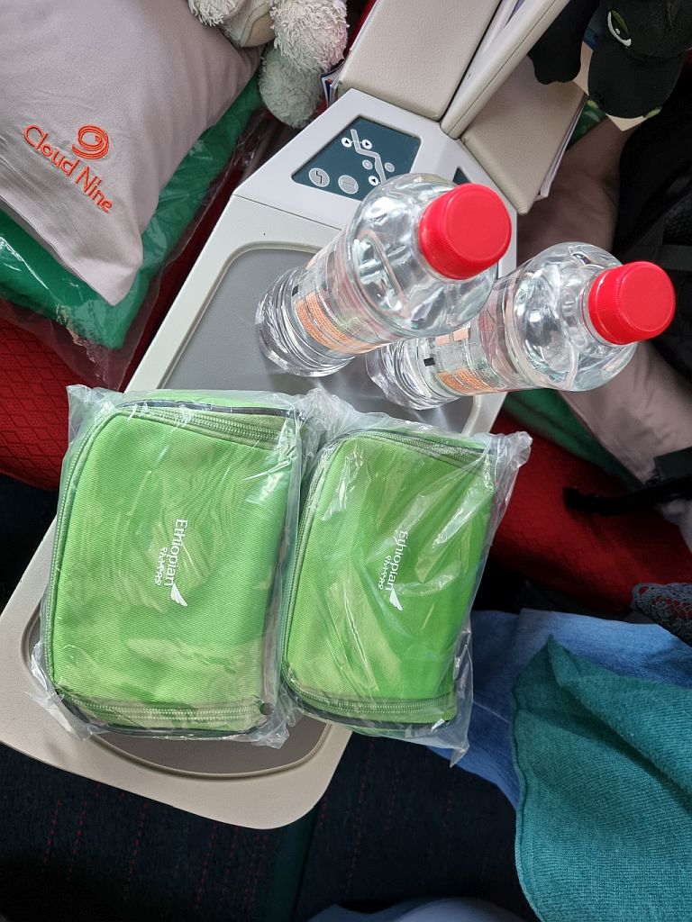 Ach ja, im Gegensatz zum Hinflug bekamen wir auch gleich jeweils ein Amanety Kit und eine Wasserflasche ausgehändigt. Da wir in Addis Ababa ja eine Weile Aufenthalt haben, ist gerade die Zahnbürste beziehungsweise Zahnpasta sehr willkommen.