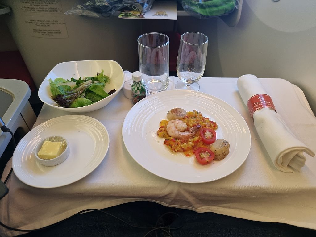 2 Stunden vor der Landung gab es dann wieder was zu Essen, bei einer Flugzeit von knapp über 5 Stunden schon fast stressig, aber wie wir ja gelernt haben: Man scheint immer zu glauben, dass wir kurz vor dem Verhungern sind.