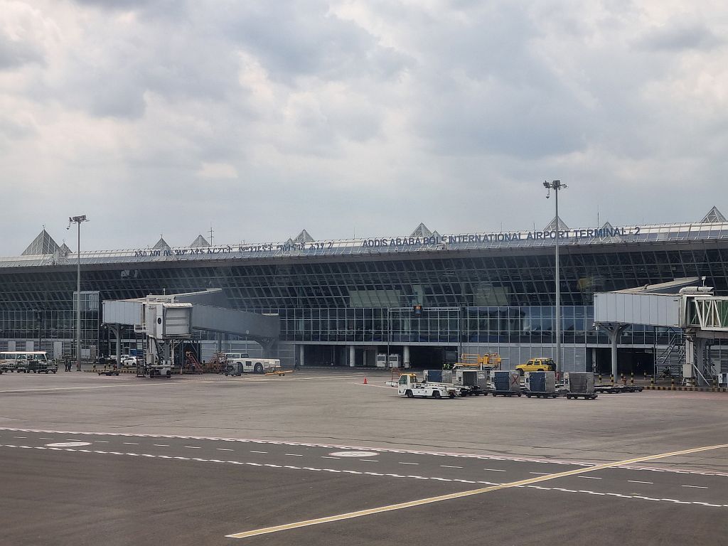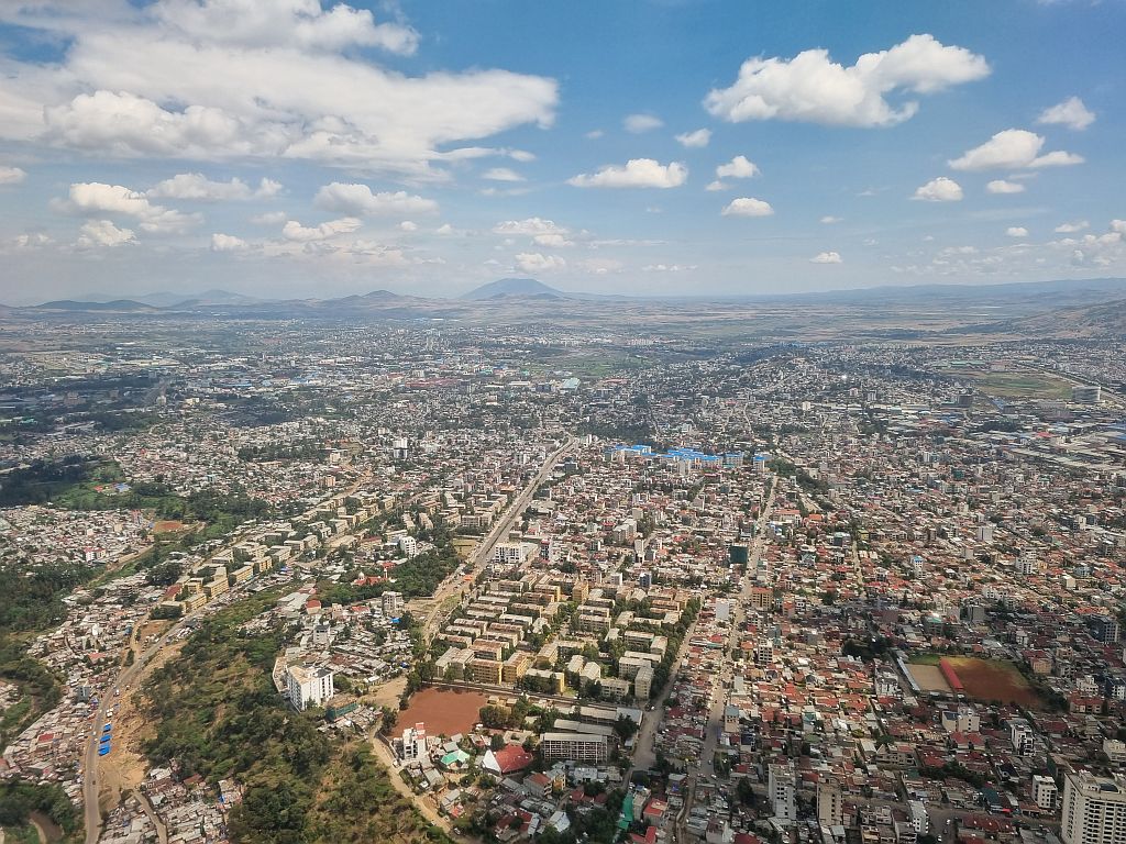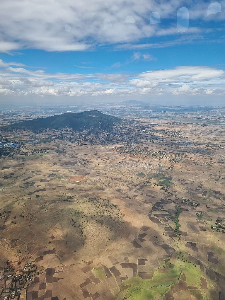 Überpünktlich kam dann auch Addis Ababa und der Berg Yerer mit 3.101 Metern in Sicht. Die Hauptstadt Äthiopiens ist von mehreren Bergen umgeben und wie auch schon beim Flug von Brüssel hierher müssen wir sagen: Der Anflug ist schon echt cool hier!