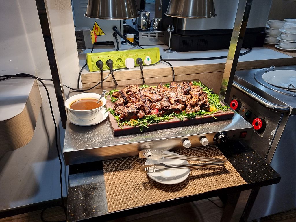 Um 19 Uhr gingen wir dann in ein Restaurant direkt vor dem Hoteleingang Essen. War jetzt nicht wir in dem richtigen Skylight Hotel, wo es 19 (!) Restaurants gibt, aus denen man auswählen kann und hier hatte man auch nicht den Ausblick auf die Stadt und den Flughafen, aber einem geschenkten Gaul schaut man ja bekanntlich nicht ins Maul.