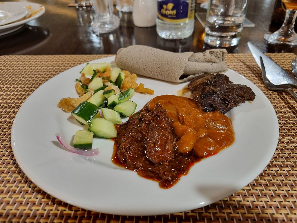 Selbstverständlich gab es hier auch Injira, der Sauerteig-Fladen, mit dem man das Essen aufnimmt und in den Mund befördert. Und dazu gab es diverse leckere Gerichte, von denen uns Shiro Wat, ein Püree aus Kichererbsen und Bohnen, was mit Zwiebeln, Knoblauch, Tomaten, Ingwer und Chili zubereitet wird. Sehr scharf, wie vieles hier und die Gurke war echt hilfreich. Genauso wie das Wasser und das zweite Bier, was wir uns auch noch gönnten.