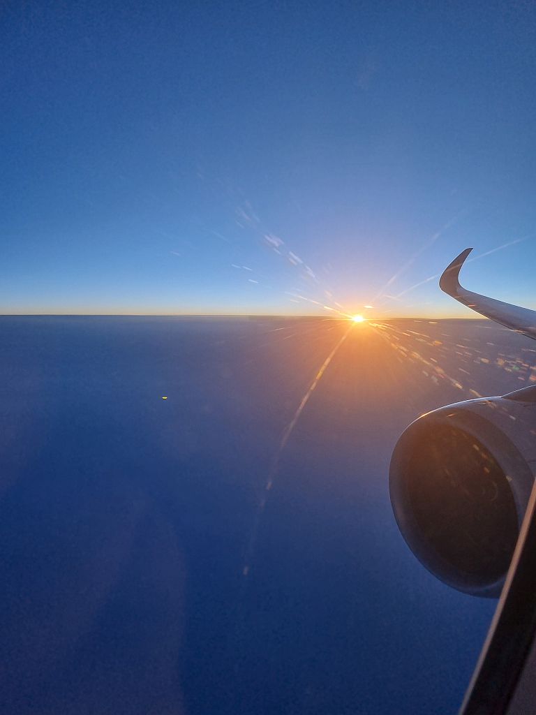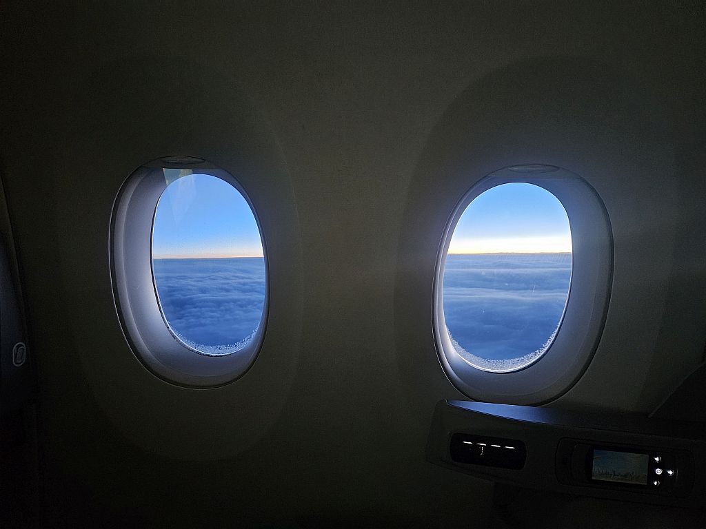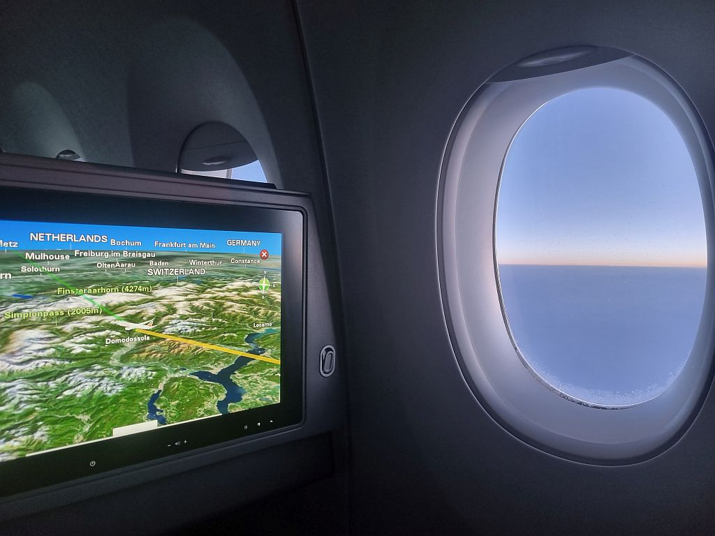 Sobald die Anschnallzeichen ausgeschaltet waren, legten wir unsere Sitze flach, legten Schlafmaske und Noise-Cancelling Kopfhörer an und richteten uns gemütlich ein, soweit das ging. Meike hatte auf diesem Flug eher Probleme zu schlafen, Jens dagegen wachte irgendwo über Italien auf.