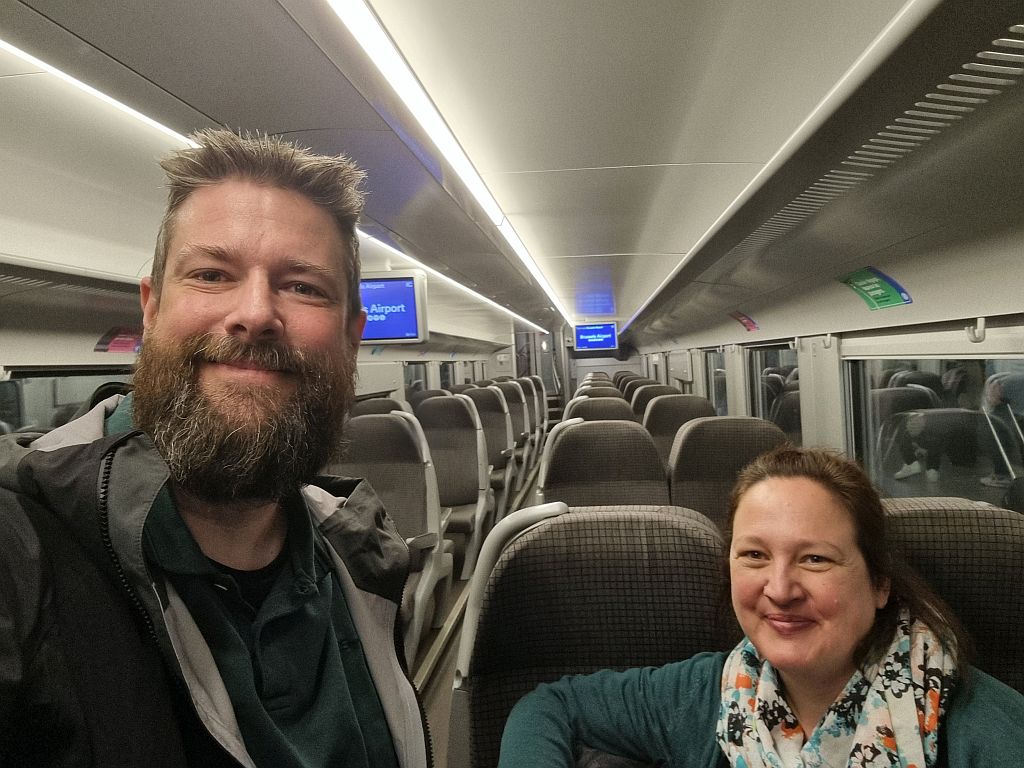 Die Tickets kaufte Jens per App, sodass wir einfach durch die Bahnsteigkontrolle durchgehen und in den bald einfahrenden Zug einsteigen konnten. Von der Landung um 7:24 Uhr hatte es nur 30 Minuten gebraucht, bis wir im Zug waren. Da haben wir in Düsseldorf schonmal länger nur auf das Gepäck gewartet.