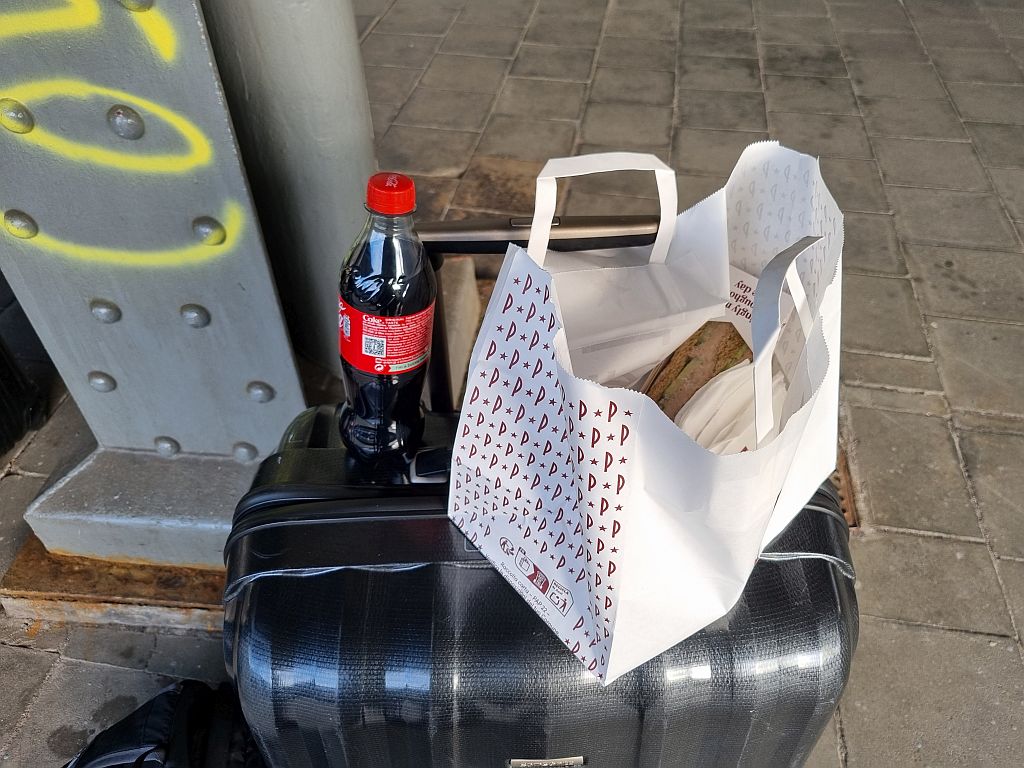 Schade für sie, dass das Teil des Bandes nicht in Betrieb war und ihre Tasche also an Ort und Stelle blieb. Jens nahm sich zwei weiter Schalen, lud sie voll und trug sie zu dem rollenden Band, wodurch seine Sachen also direkt gescannt wurden. Und die der wartenden Dränglerin nicht. Hah!