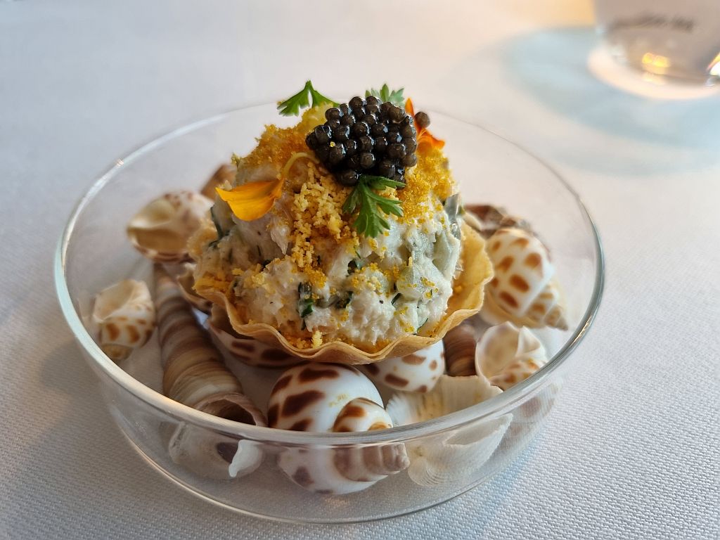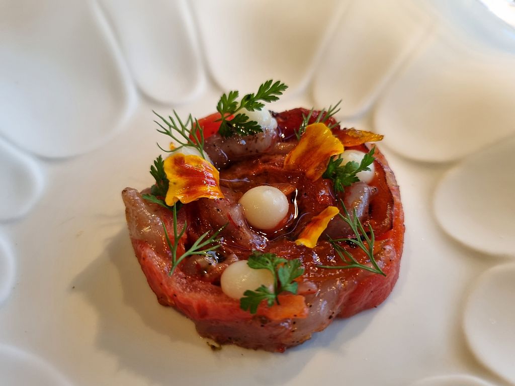 Frisch, saftig, der Kaviar mal wieder intelligent zur Verstärkung des Salzaromas eingesetzt und mit einem schönen geriebenen Eigelb sehr vollmundig. Und auch schön anzusehen, denn hier wird auch sehr viel auf die Präsentation geachtet. Wie kann man auch nicht bei diesem Ausblick.
