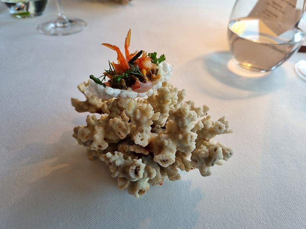 Fokus blieb aber auf dem Essen und es wurde immer klarer, dass hier kleine Kunstwerke auf dem Tisch präsentiert werden. Bestes Beispiel: „What the corals know“, ein Zusammenspiel aus einem Korallenchip mit Schrimps, Seeigel, Bottarga und Muscheln.
