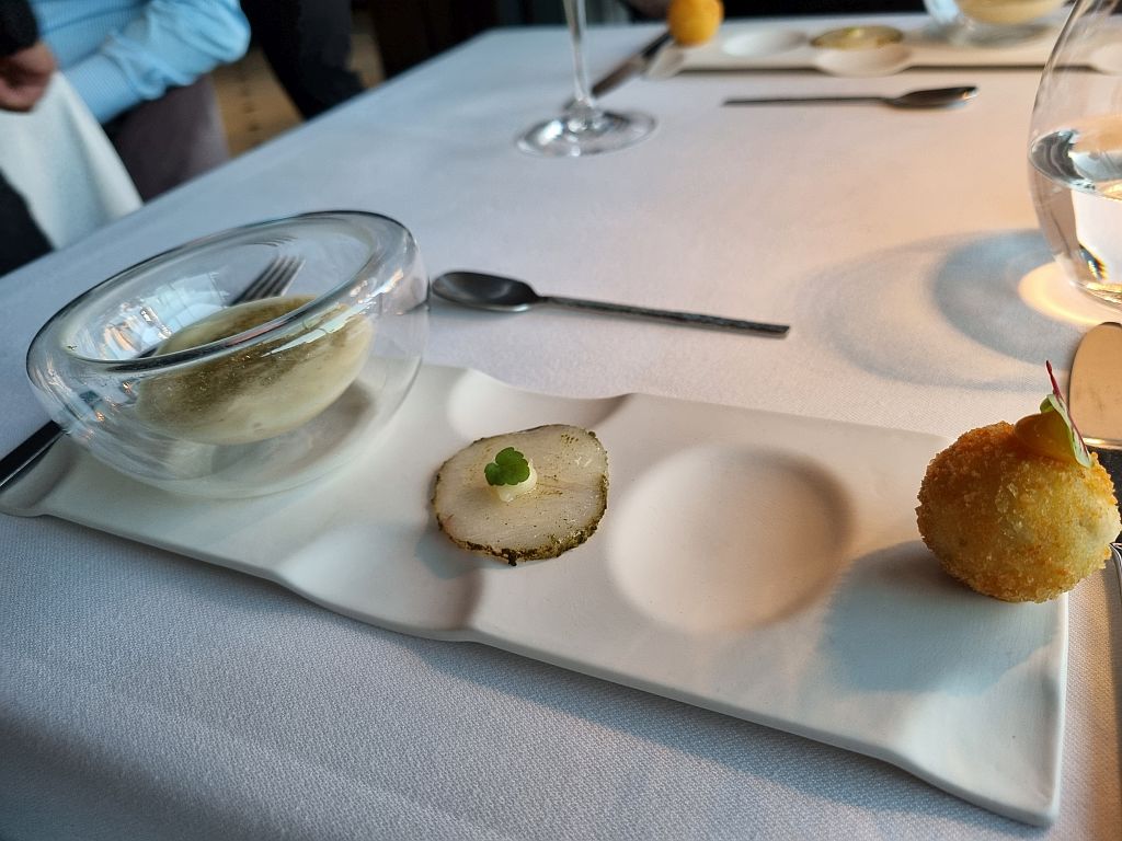 Der nächste Gang war dann wieder dem Frühling angemessen: Carpaccio vom Kabeljau, eine Krokette mit Kabeljau (so eine Art Bitterballen) und eine Kabeljau-Creme.
