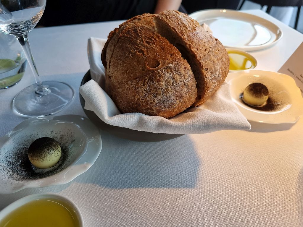Das Brot mit sehr gutem Olivenöl und einer Butter mit Lauchasche half dann über die kleine Pause hinweg, in der mehrere Tische in einen Takt gebracht wurden.