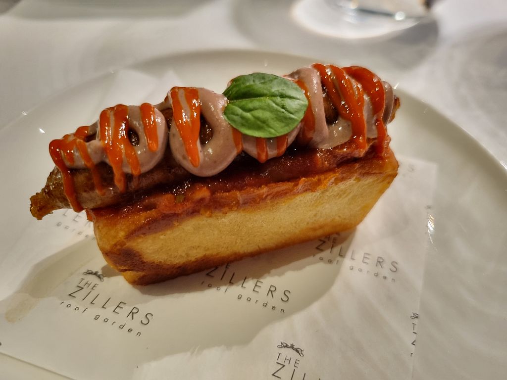 Der nächste Gang war dann nur für Jens, der wieder zwei Gänge mehr geordert hatte. Und es sollte auch ein Gang sein, der ein paar Fragezeichen hinterließ, denn der Hot Dog vom Hahn mit Foie Gras war dann irgendwie doch zu experimentell. Die Fois Gras passe irgendwie gar nicht, hier wäre eine Pilzcreme oder sowas passender gewesen und es schien doch wieder einmal so, dass man solche Zutaten verwendet, weil man glaubt es als Sterne-Restaurant zu müssen.