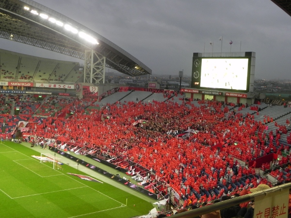 Glücklicherweise ist der Gästeblock super voll und der Heimblock von Urawa auch recht gut gefüllt, sodass die Fanblöcke bald sehr stimmgewaltig die Musik machen. Und ausser der Tatsache, dass die Urawa-Fans die ersten 16 (!) Minuten ein und dasselbe Lied singen (das Spiel gab auch nicht mehr her – ich glaube ja, dass das so eine Art Abmachung mit den Spielern war: „Solange ihr nix macht, singen wir dieses bekloppte Lied! Wollen mal sehen, wer hier länger aushält …“) war die Stimmung wirklich super!