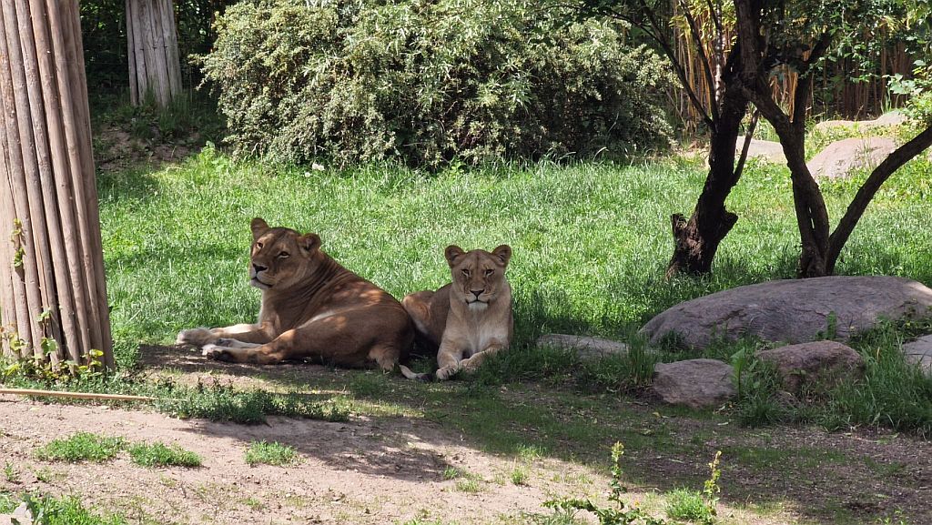Kigali hat in der Nacht auf den 5. Juli 2024 vier Jungtiere geboren. Bislang kümmert sie sich vorbildlich um den Nachwuchs, der wohlgenährt aussieht und häufig beim Trinken gesehen wird. Die vier Jungtiere entwickeln sich augenscheinlich gut und werden ausschließlich von Kigali betreut. Die Löwen sind in der Mutterstube, die für die Besucher nicht einsehbar ist. Dafür aber ein paar andere Mitglieder der Herde, die aufgrund der gerade stattfindenden Fütterung, sehr präsentabel zu sehen waren.