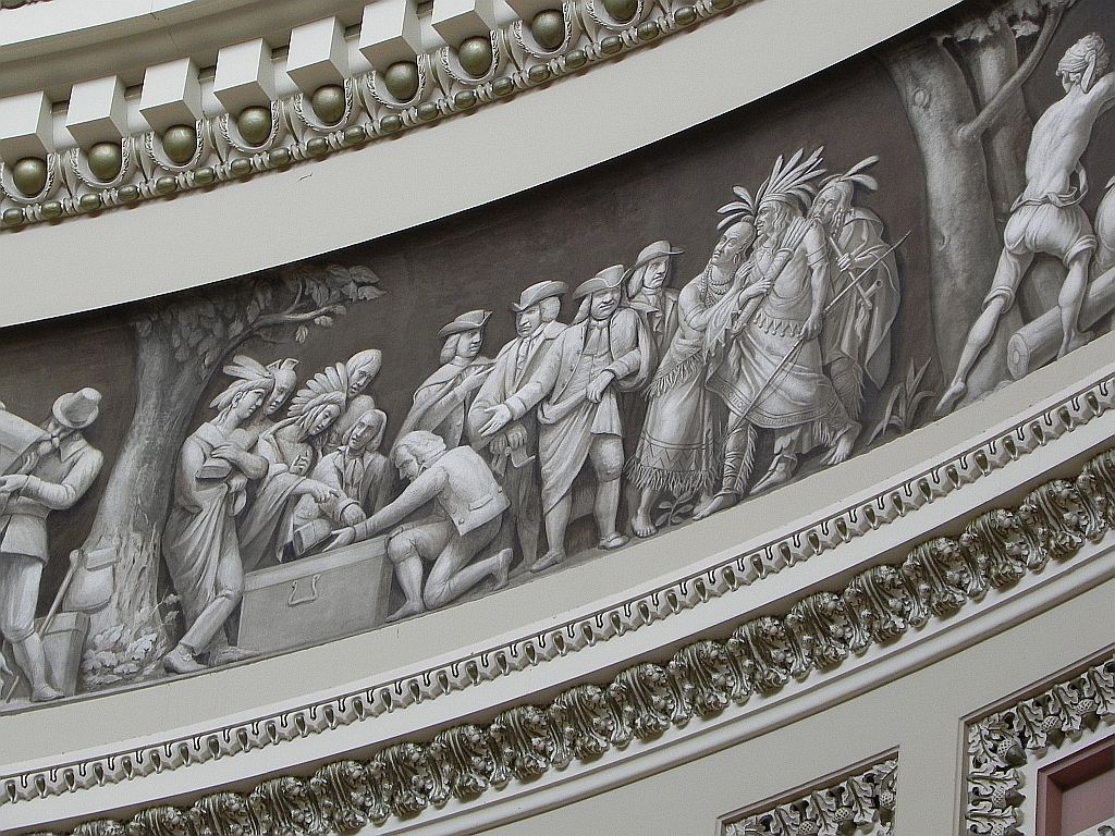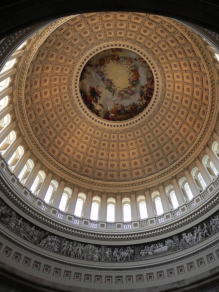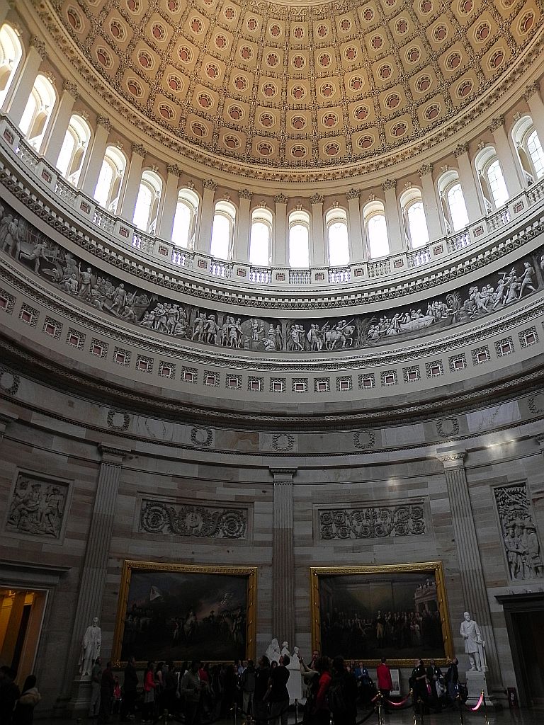 Auch kann man hier das „Fries der amerikanischen Geschichte“ bewundern (die Malerei im Bild oben, was man unter den Säulengang sieht), welches 19 Szenen aus der amerikanischen Geschichte darstellt. Das Fries wurde, wie die Malerei in der Kuppel selber, vom italienischen Maler Constantino Brumidi angefertigt. Interessant fanden wir dabei, dass Brumidi bei der Malerei an der 8. Szene vom Gerüst gefallen ist und 15 Minuten am Geländer hing, bevor er gerettet wurde.