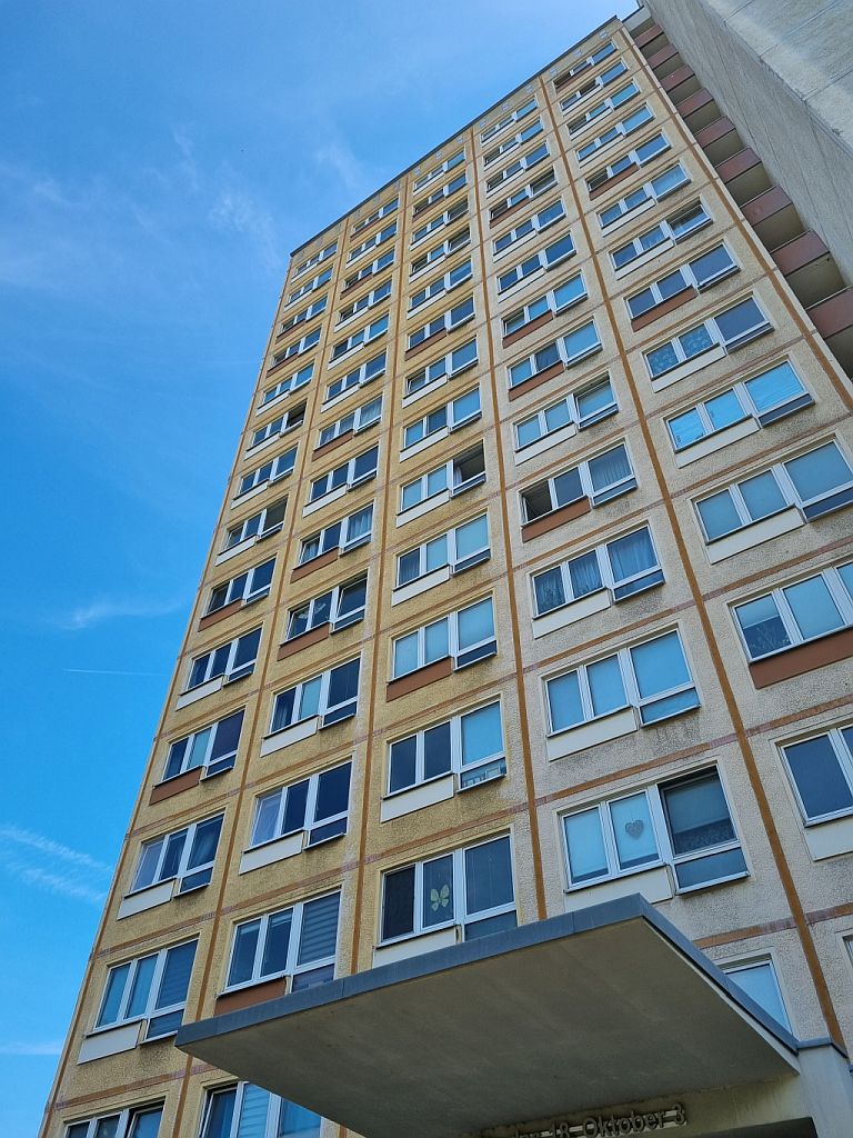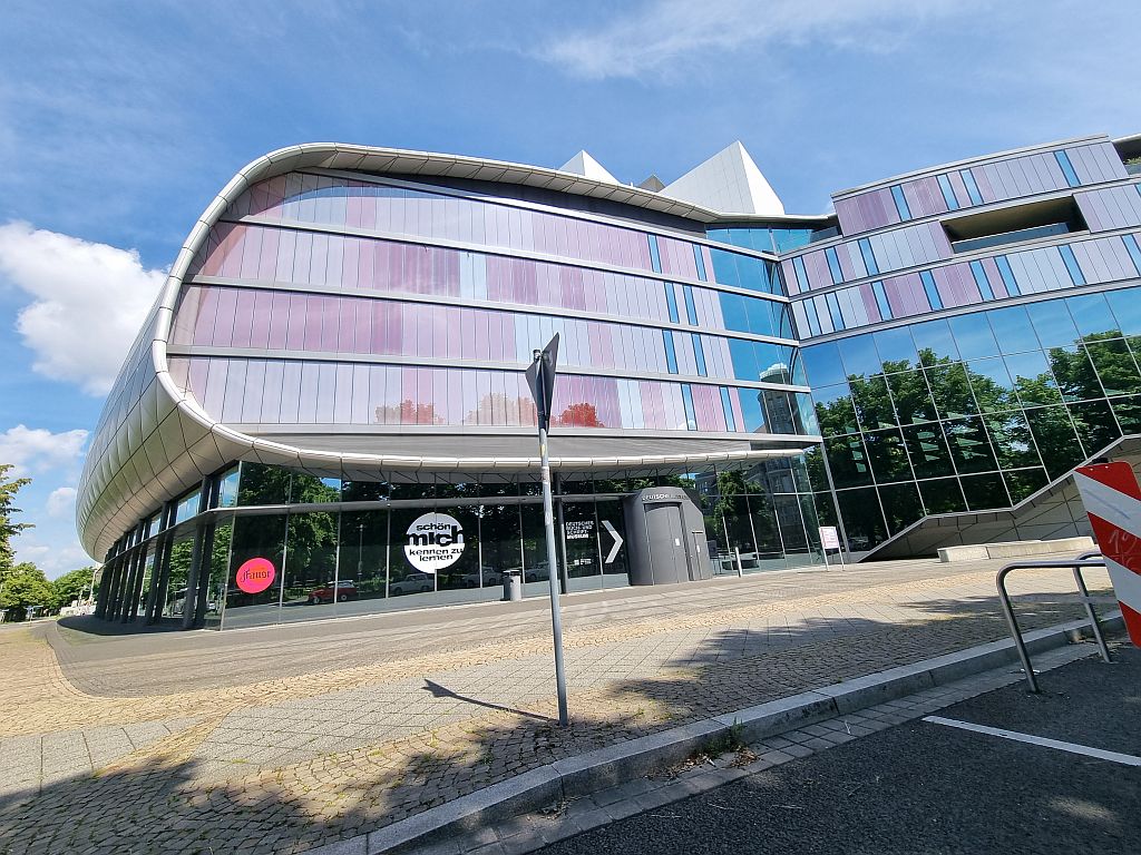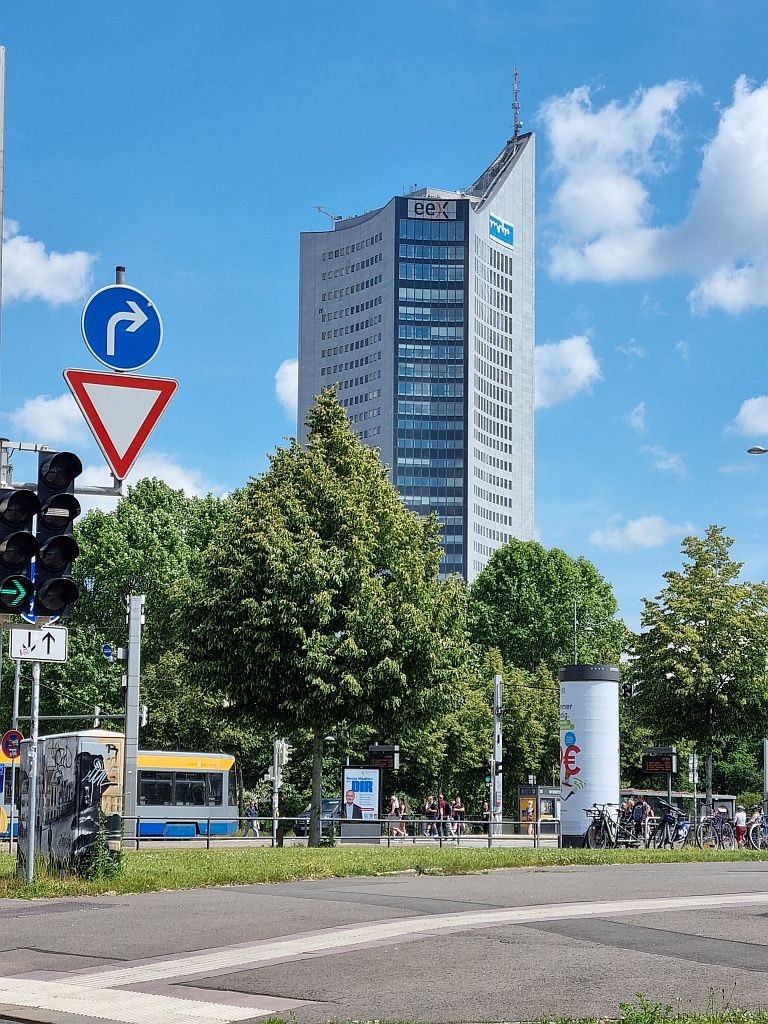 In der Ferne war dann wieder etwas modernes sichtbar, nämlich das City-Hochhaus Leipzig, was am südwestlichen Rand des Augustusplatzes steht. Mit 34 Etagen ist es ein Wahrzeichen der Stadt und mit 142,5 Metern das höchste Gebäude Leipzigs. Aufgrund der drei langen, leicht nach innen gewölbten Längsseiten bei einer überhöhten Schmalseite kann die Form des Gebäudes aus Straßensicht als ein aufgeschlagenes Buch interpretiert werden. Wegen seiner ursprünglichen Nutzung durch die Universität Leipzig entstand im Volksmund der Name Uniriese. Oder „Professoren-Abschussrampe“ …