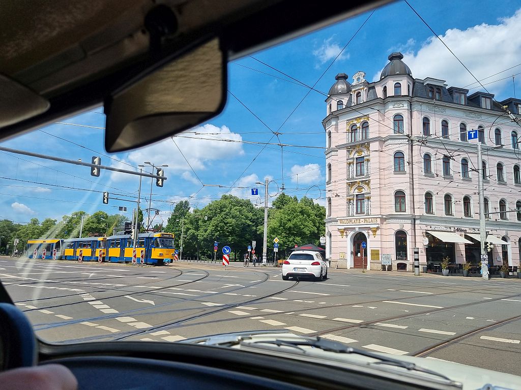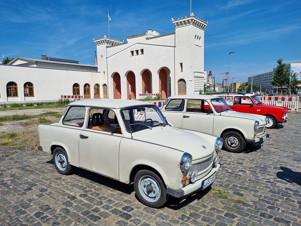 Mit zwei weiteren Trabanten … Trabbis? Trabbae? Autos ging es dann auf in Richtung alte Messe. Per Funk waren wir mit dem Führungs-Trabbi verbunden und wurden überaus unterhaltsam durch die Stadt geleitet.