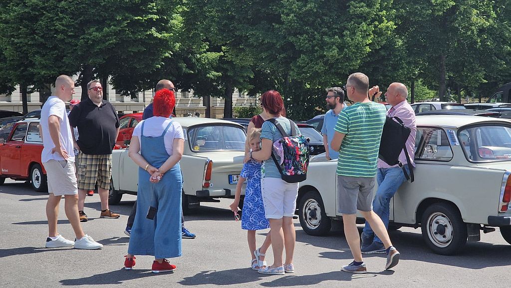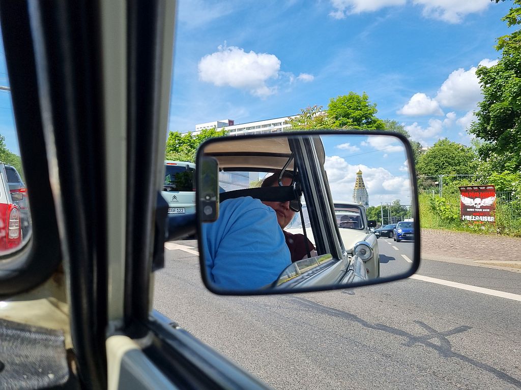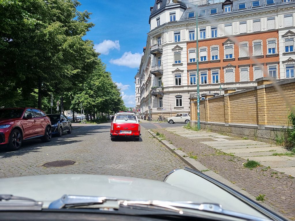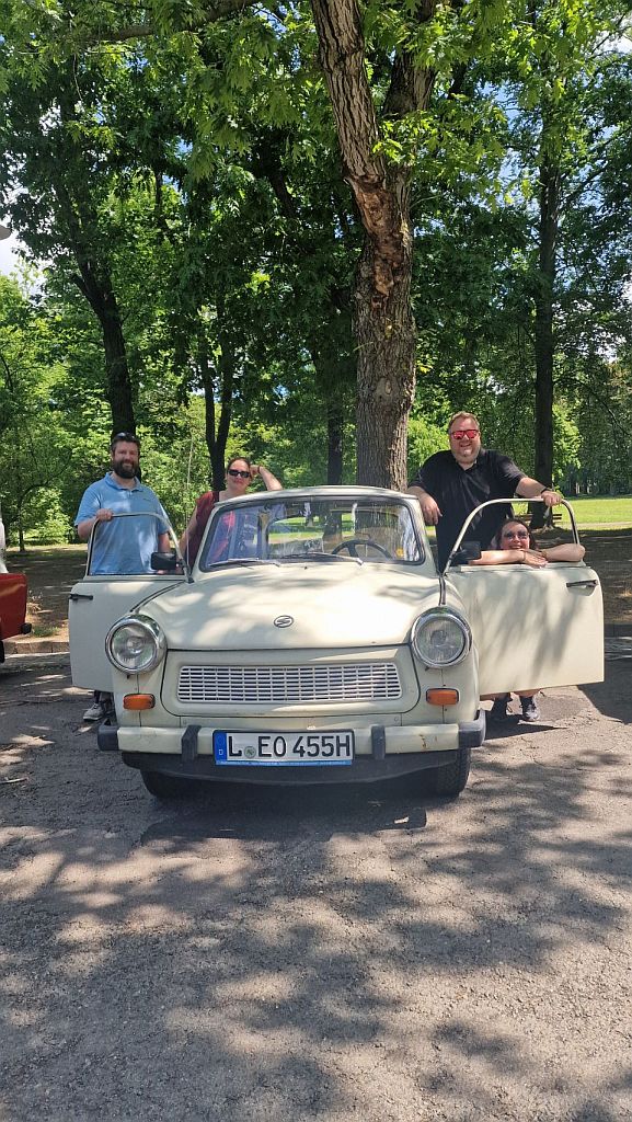 Mit ordentlich „Geknatter“ und mit diversen Sprüchen unseres Guides ging es dann weiter. Dabei wurden auch links und rechts des Weges Sehenswürdigkeiten gezeigt, Geschichten erzählt und auch immer wieder auf die Vollständigkeit der Trabbi-Kolonne geachtet. Mal mit mehr, mal mit weniger Erfolg, denn zwei Mal haben wir den jeweils hintersten Trabant an einer Ampel verloren. Die Duroplast-Karren mit ihren 27 PS starken Motoren und die fehlende Servo-Lenkung waren eine Herausforderung und ein valider Ersatz für den Besuch in einem Fitnessstudio.