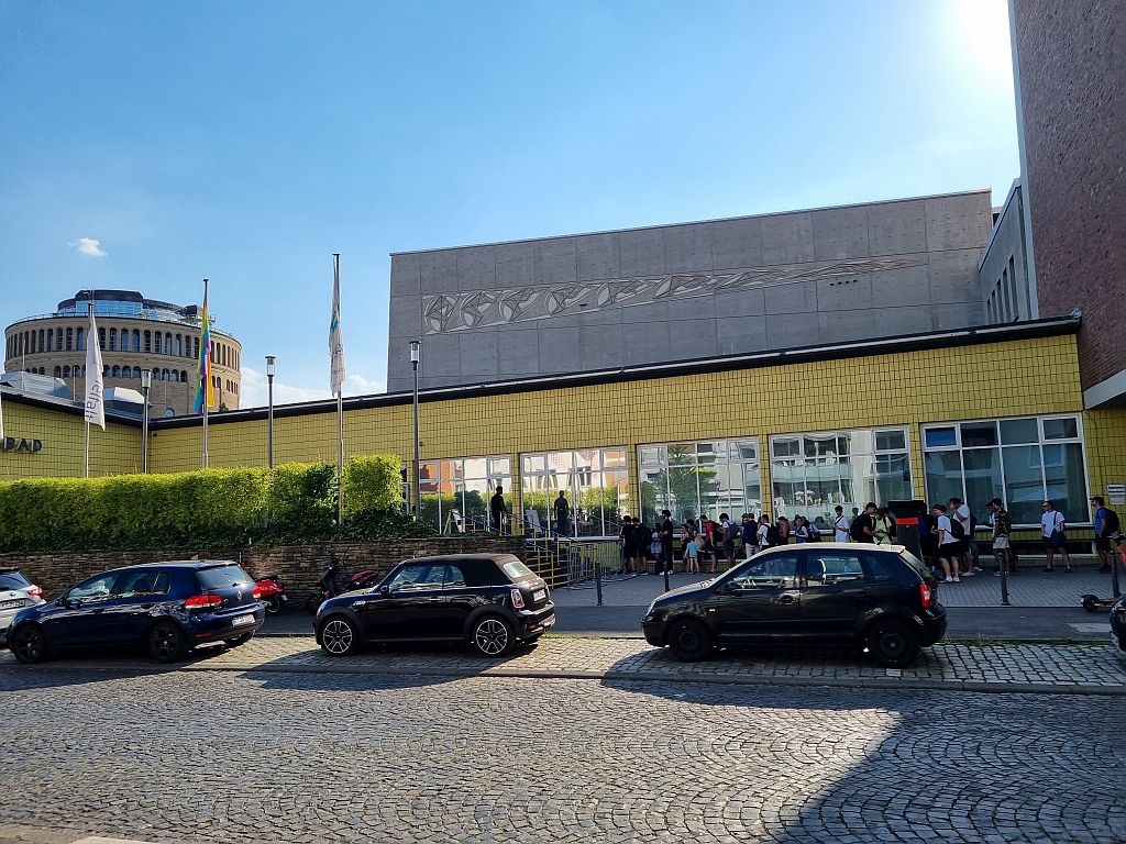 Wir waren also relativ entspannt, wenn auch immer noch sehr, sehr schwitzig, als wir in der Nähe des Agrippabades aus dem (ebenfalls schön klimatisierten) Taxi stiegen. Am Eingang zum Bad standen noch eine ganze Menge Menschen an, in der Hoffnung auf etwas Abkühlung und das um 18:30 Uhr.