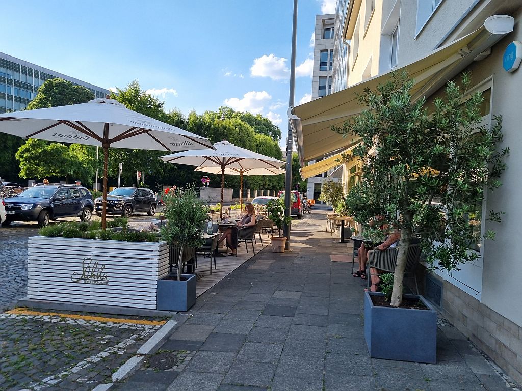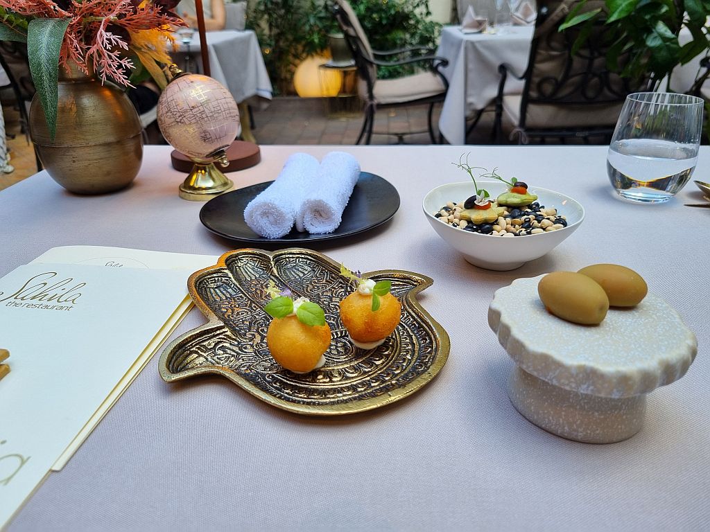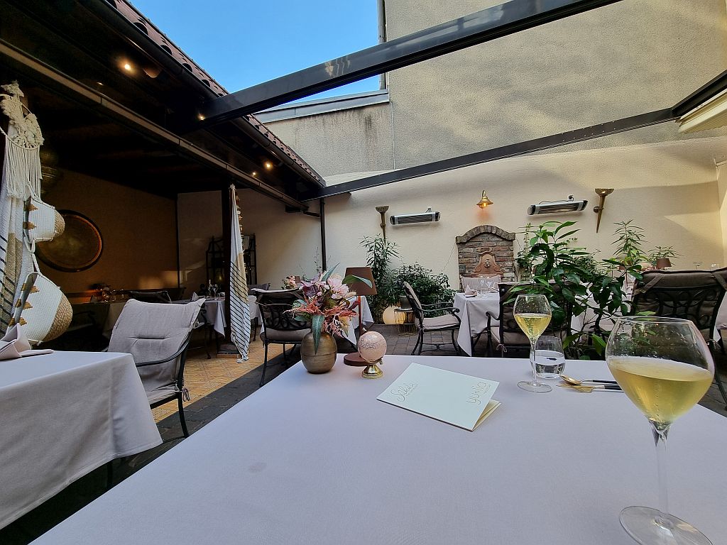 Unbestritten sind die handwerklichen Fähigkeiten der Küche, also wollten wir uns mal unser eigenes Bild bilden. Ein Tisch war schnell online reserviert, wie fuhren, wie gesagt, mit dem Taxi hin und nahmen bei äußerst unangenehmen Temperaturen um die 36, 37 Grad Celsius im Innenhof Platz.