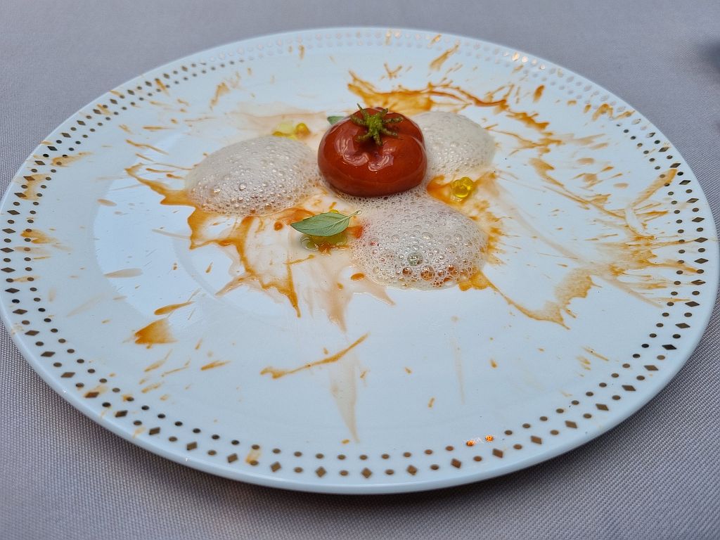 Der erste Gang im Menü kam mit der Geschichte der Tomatina, einem spanischen Fest in der Nähe von Valencia, welches jährlich im Rahmen der Stadtfeier veranstaltet wird. Bei dem Fest bewerfen sich die Teilnehmer mit überreifen Tomaten, was auf dem Teller über eine „Fake“-Tomate aus Gel mit einem Kern aus Tomatenpüree sowie Schaum aus Tomatenessenz, kleinen Perlen aus Olivenöl und einem hervorragenden Brot, auf das man eine offene Cherrytomate streichen sollte.