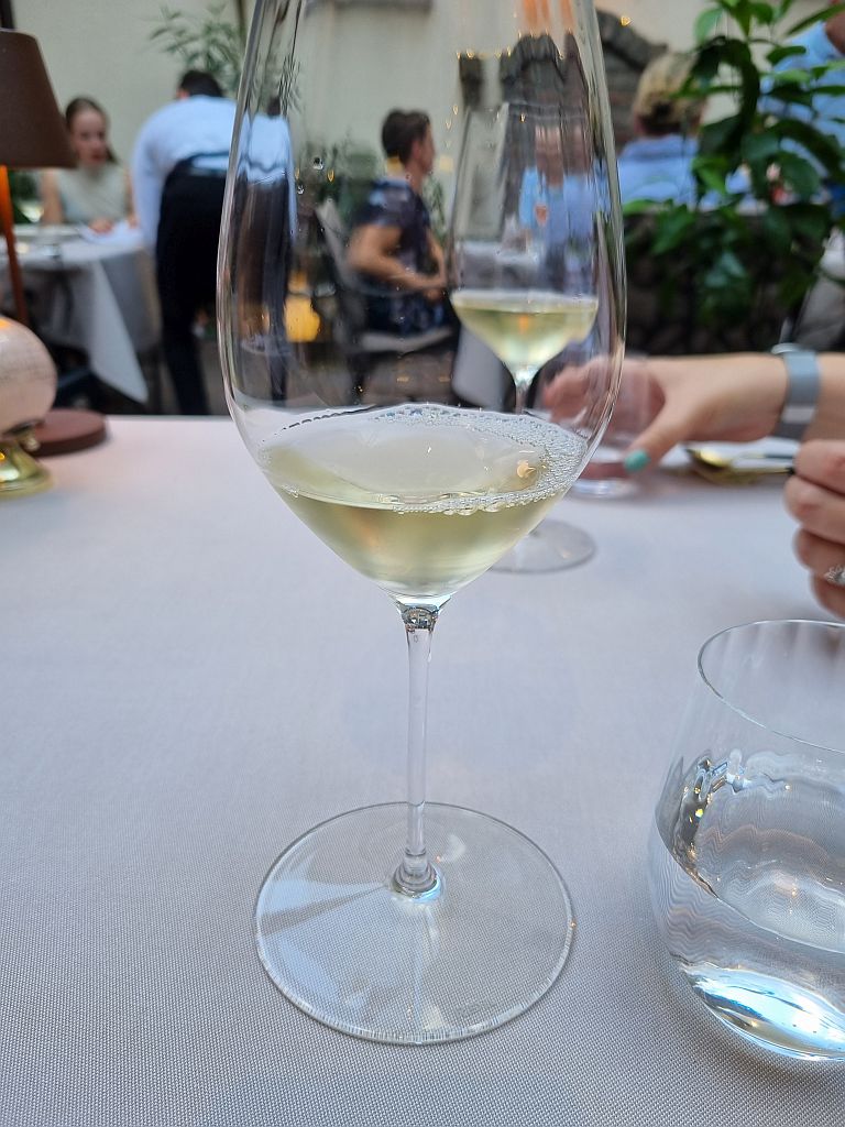 Der Innenhof ist eine taktisch gute Entscheidung, auch wenn es ohne ein bisschen Wind in unserer Ecke doch etwas schwül war. Ein Aperetif war schnell geordert, Wasser gab es auch direkt, bei dem Wetter auch dringend nötig.