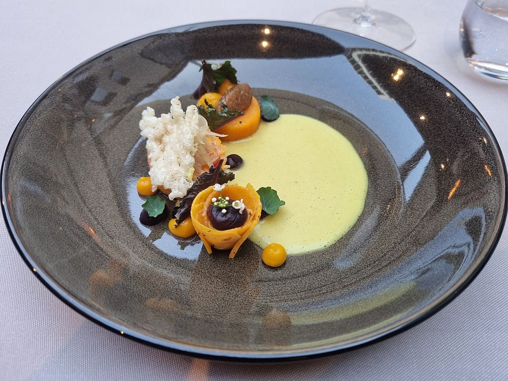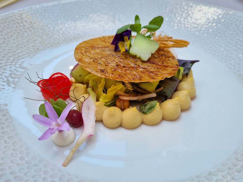 Der Salat war etwas gröber geschnitten, die Komponenten waren aber sehr lecker. Wenn auch die Aromenwelt mit dem Portulak, weiteren Kräutern, Zwiebeln, Hummus, Radieschen und Blüten wieder eine etwas leichtere, subtilere war, was wir auch anmerkten. Und daraufhin auf die nächsten zwei Gänge verwiesen wurden.