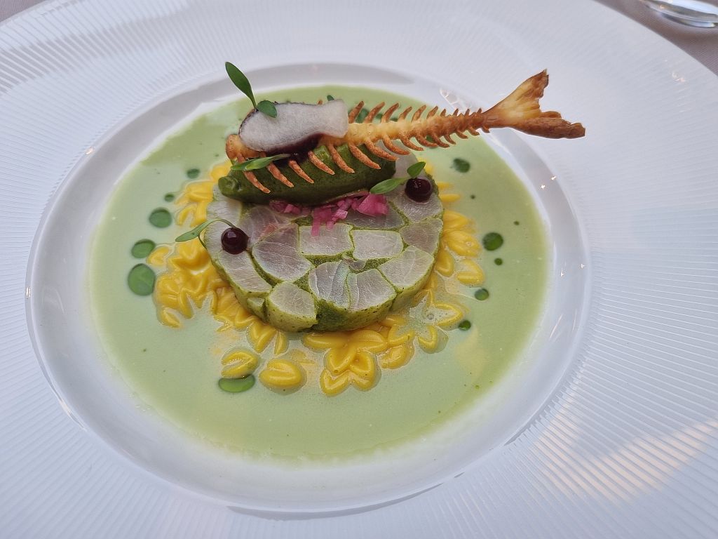 2023 wurde der Titel „Praktiken und Bedeutungen im Zusammenhang mit der Zubereitung und dem Verzehr von Ceviche, ein Ausdruck der traditionellen peruanischen Küche“ in die UNESCO-Liste des immateriellen Kulturerbes der Menschheit aufgenommen. Wobei wir hier eine eher mittelamerikanische Variante zubereitet bekamen, bei der anstelle der Tigermilch Kokosmilch genommen wird. Dazu gab es noch ein Granite aus Jalapeño dazu, wobei schon im Sud selber ein sehr scharfes Öl die Geschmacksaromen auf eine angenehme Probe stellten. Sterne aus Maiscreme wurden unter dem Hiramasa zu einer leichten, süßen Ablenkung vom festen und sehr gut marinierten Fisch. Und alles zusammen war einfach nur eines der besten Ceviche-Gerichte seit langem!