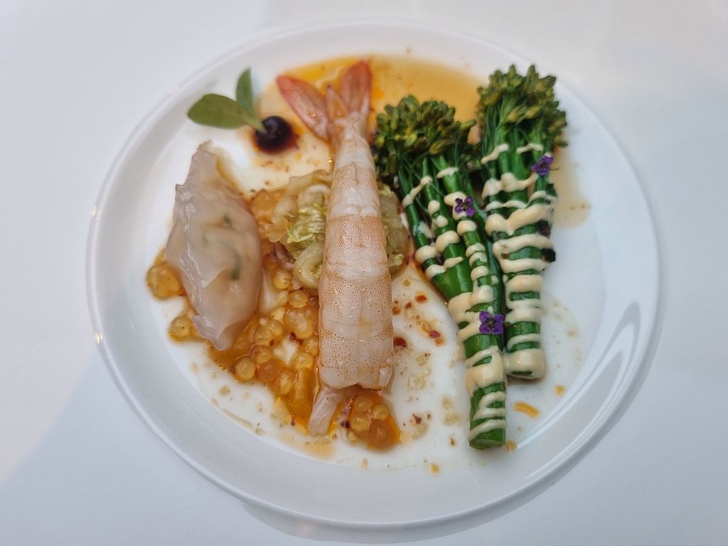 Unser Sommelier entpuppte sich als Sake-Fan und wir konnten uns hier ein wenig austauschen, gerade wo wir schon den ein oder anderen Sake konsumiert haben. Den Sake gab es zu einem Gericht, dass aus den Teehäusern Hong Kongs inspiriert wurde: Har Gow, also eine aus Reismehl hergestellte Teigtasche mit Garnele gefüllt. Dazu eine ganze Garnele aus Bayern, hervorragend in Qualität und Zubereitung. Und abgeschlossen wurde das Ganze durch Chinakohl und wildem Brokkoli.