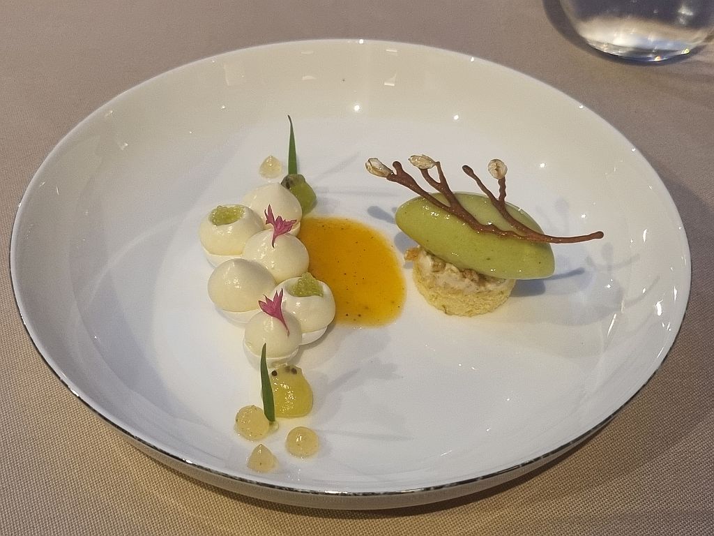Oh – geschmeckt hat das Pre Dessert, ergänzt durch Kiwi, Kaviarlimetten und Hafer, dann auch. Das eigentliche Dessert kam dann japanisch kunstvoll daher, wobei wir dann erfahren haben, dass die verantwortliche Patissier das Restaurant vor 3 Tagen verlassen hat, um im elterlichen Hof ein eigenes Geschäft zu eröffnen. Schade, denn das sah sehr cool aus!