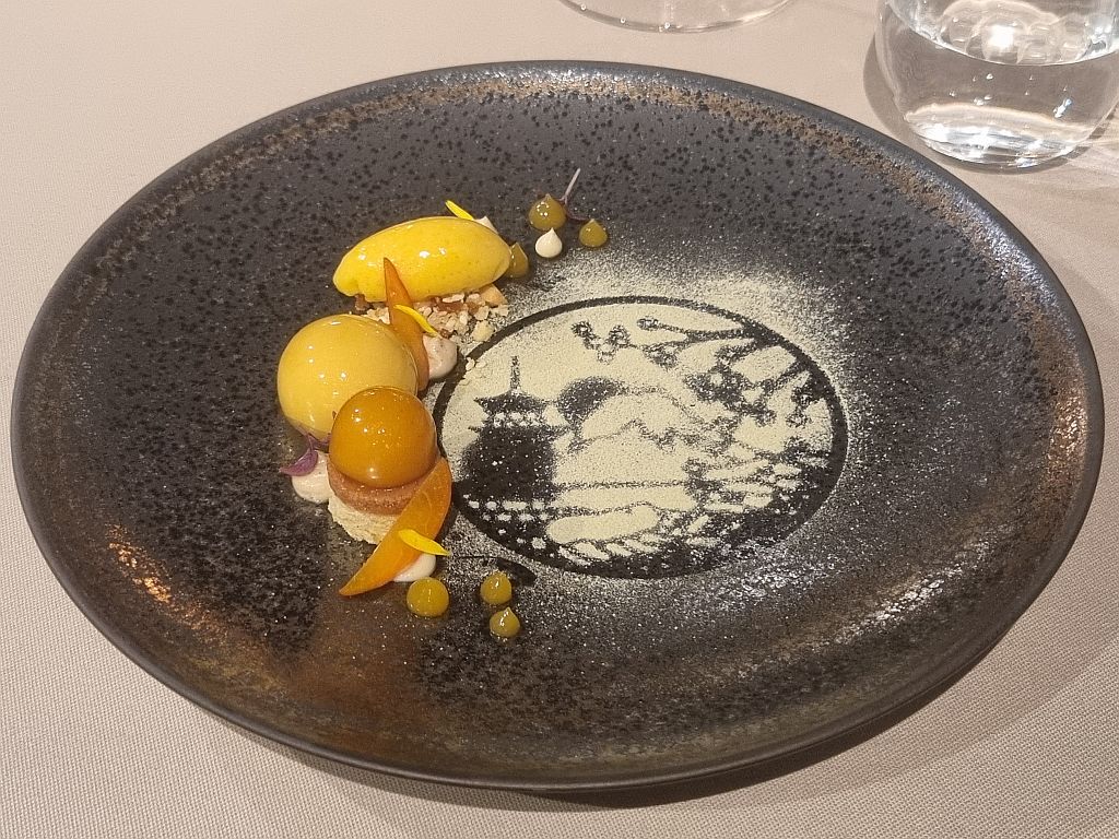 Auf dem Teller fand sich eine eher klassische Kombination aus Aprikose und Yuzu in verschiedenen Texturen und Zuständen, ergänzt durch Sesam, was dem Ganzen ein spannenden Touch gab.