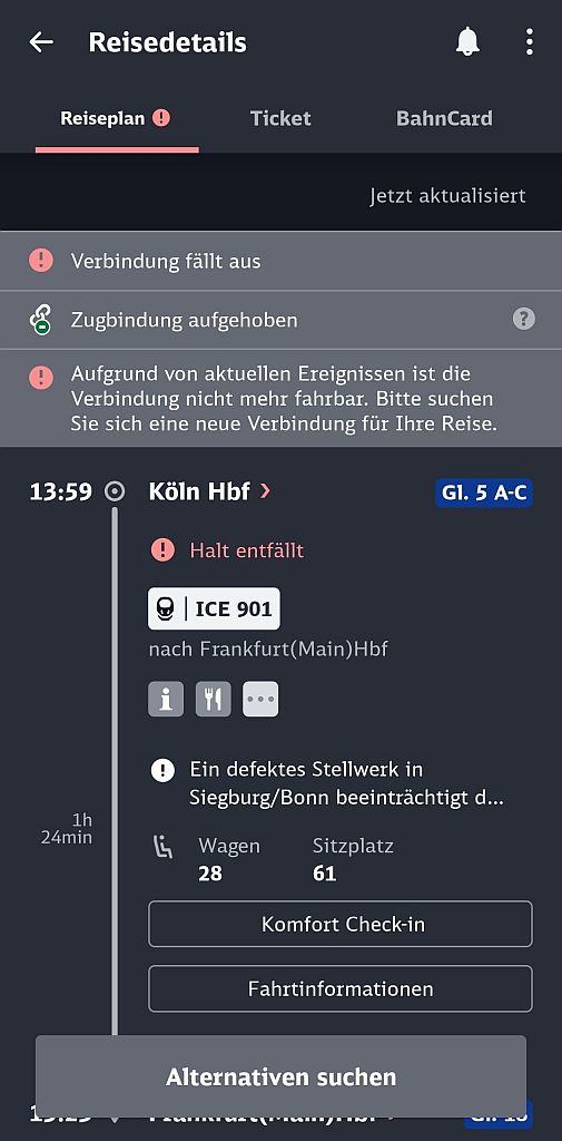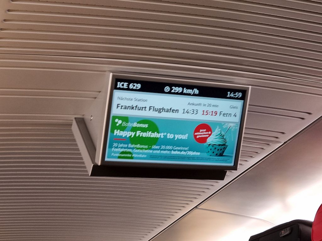 Und so kam Jens dann tatsächlich um 15:24 endlich in Frankfurt an. Mit dem ursprünglichen aber ausgefallenen ICE wäre es 15:23 gewesen. Alles also im Plan. Zumindest bei Jens.