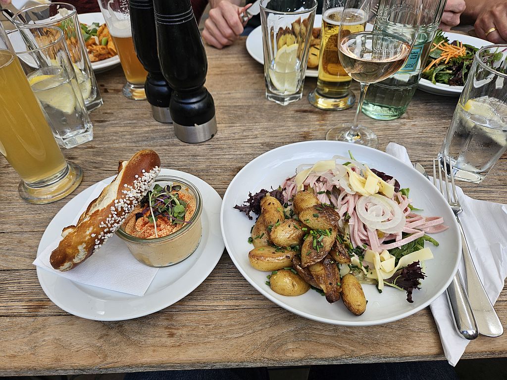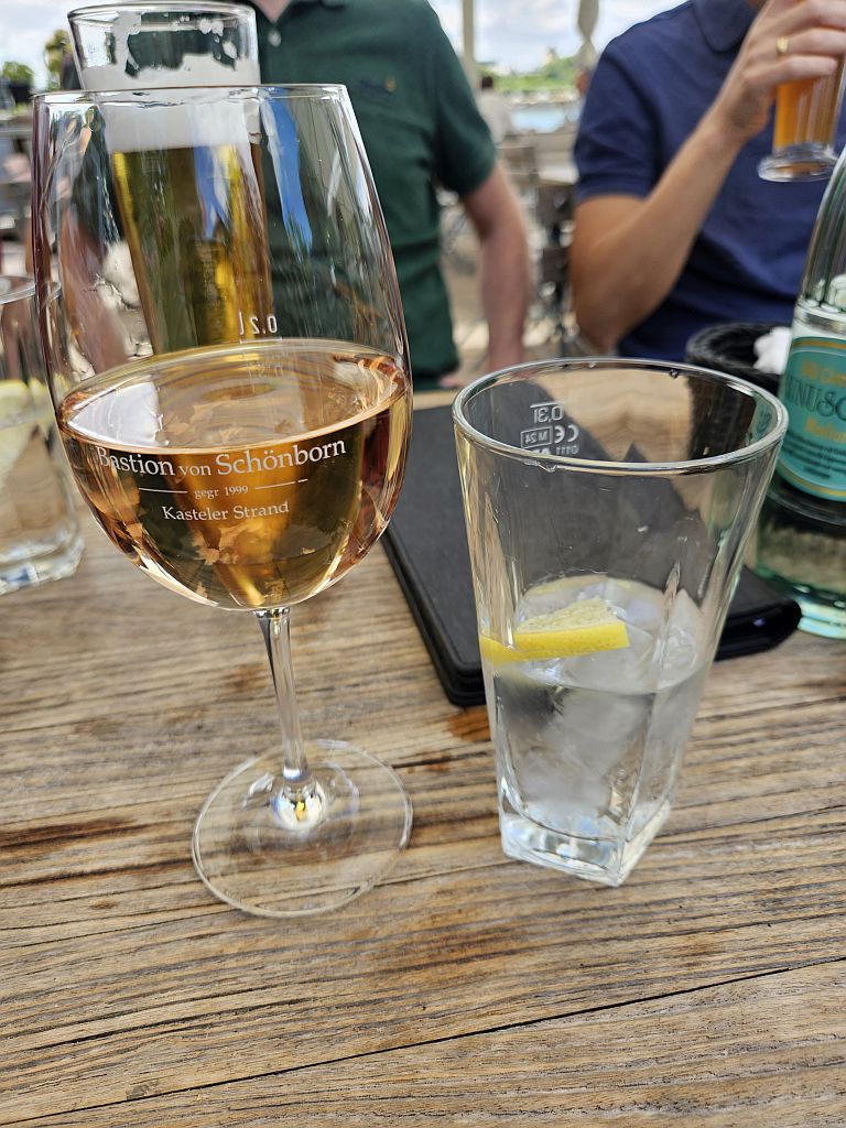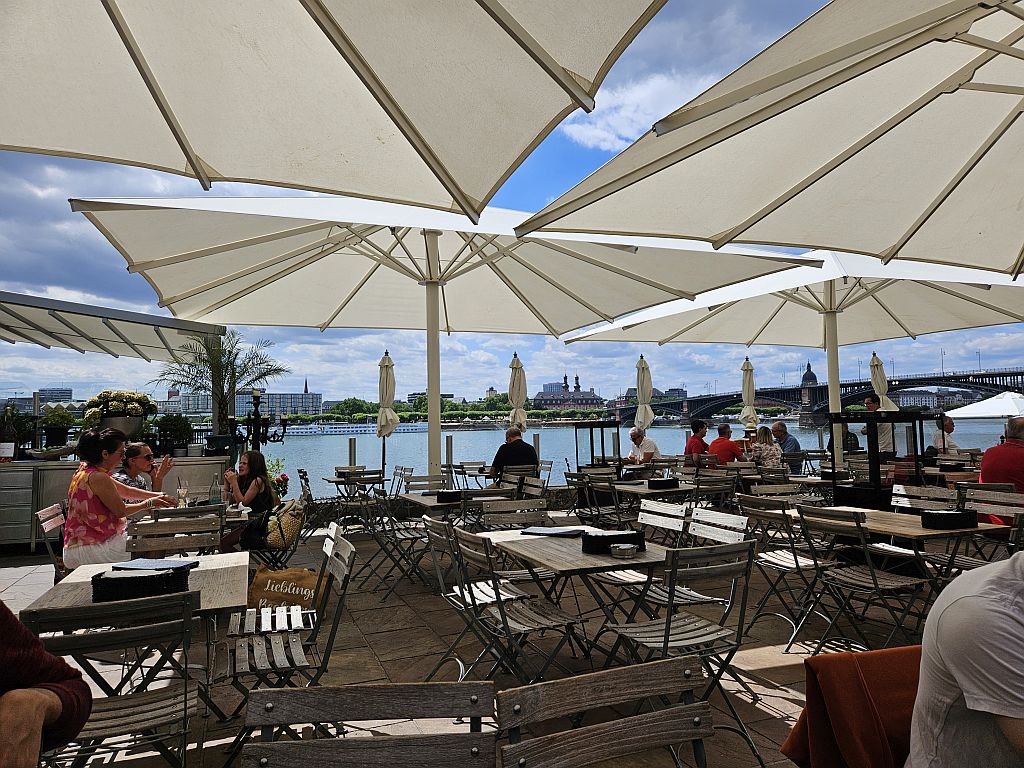 Währenddessen genoss Meike den Mittag in einem Mainzer Restaurant am Rhein und ärgerte Jens, der in einer immer größer werdenden Meute von Passagieren auf den ICE wartete, mit solchen Bildern.
