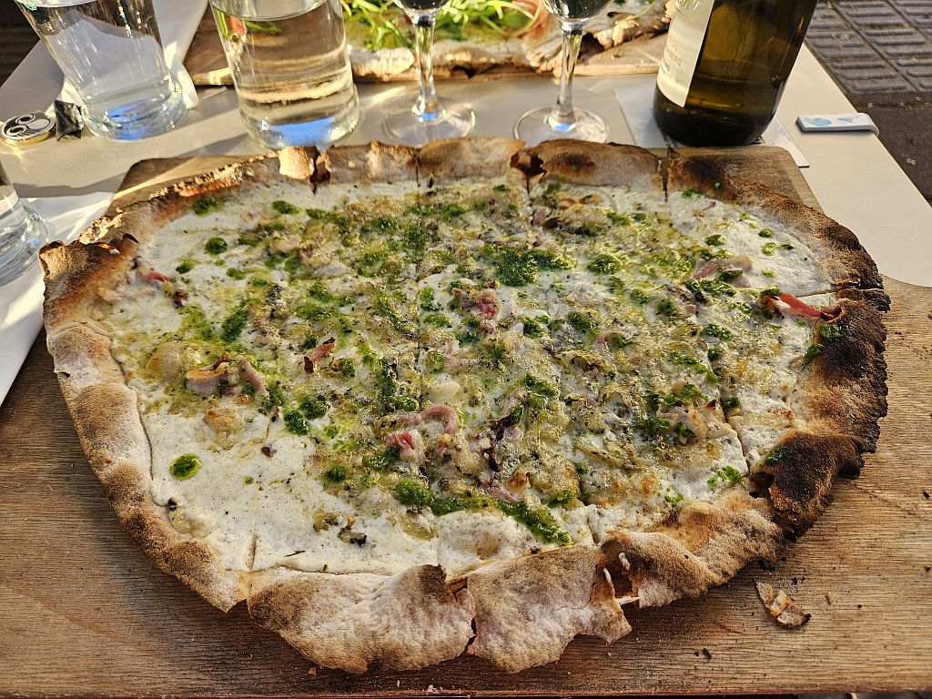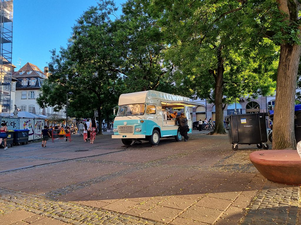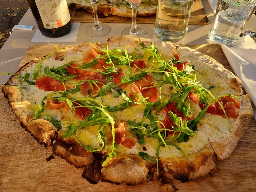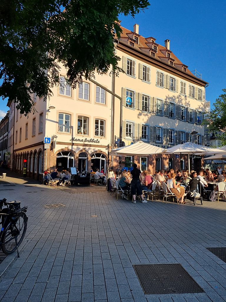 Es geht um Flammkuchen, die wir im lt. einigen Quellen besten Flammkuchen-Restaurant der Stadt, Mama Bubbele, bestellten und in der untergehenden Sonne genossen.