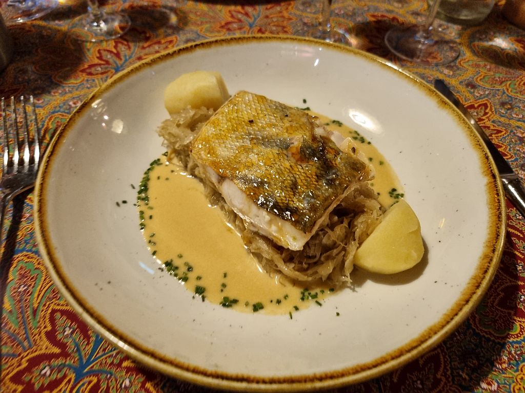 Die Hauptgänge waren aber dann der Hammer! Sauerkraut ist im Elsass allgegenwärtig und bei Jens wurde dieses mit einer super-leckeren Riesling-Sauce, jungen Kartoffeln und einem Zanderfilet, der mit einer kräftigen Glasur eingestrichen war, serviert.