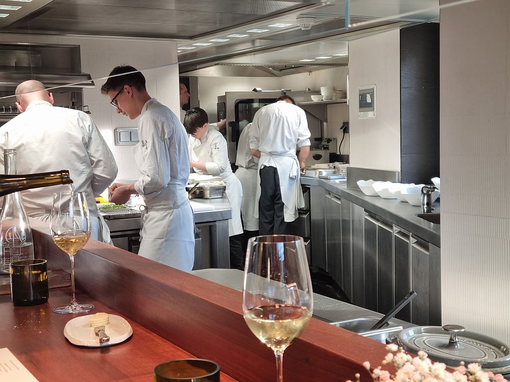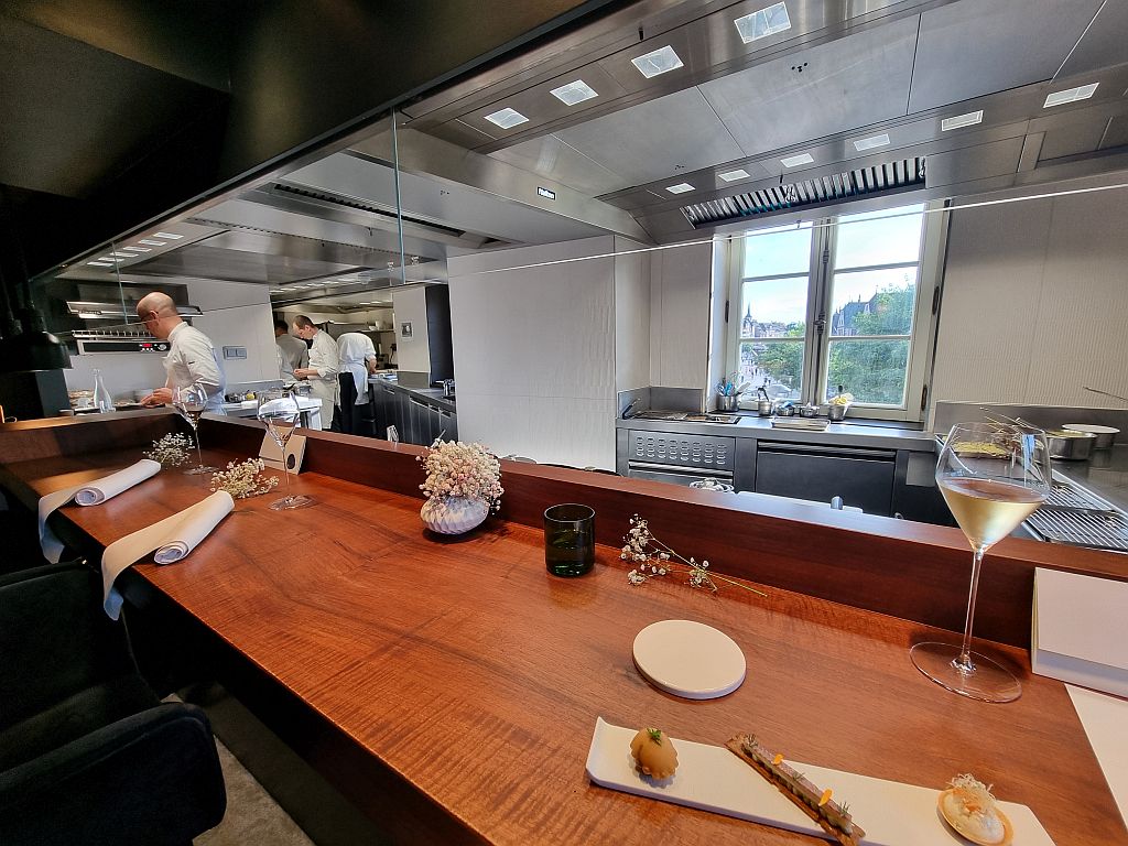 Immer wieder faszinierend zu beobachten wie ruhig die Küchencrew in so einem Restaurant arbeitet. Von den oft beschriebenen „schreienden Küchenbullen“ ist man hier Jahrzehnte entfernt. Wobei man dann wohl auch eher keine offene Küche haben würde.