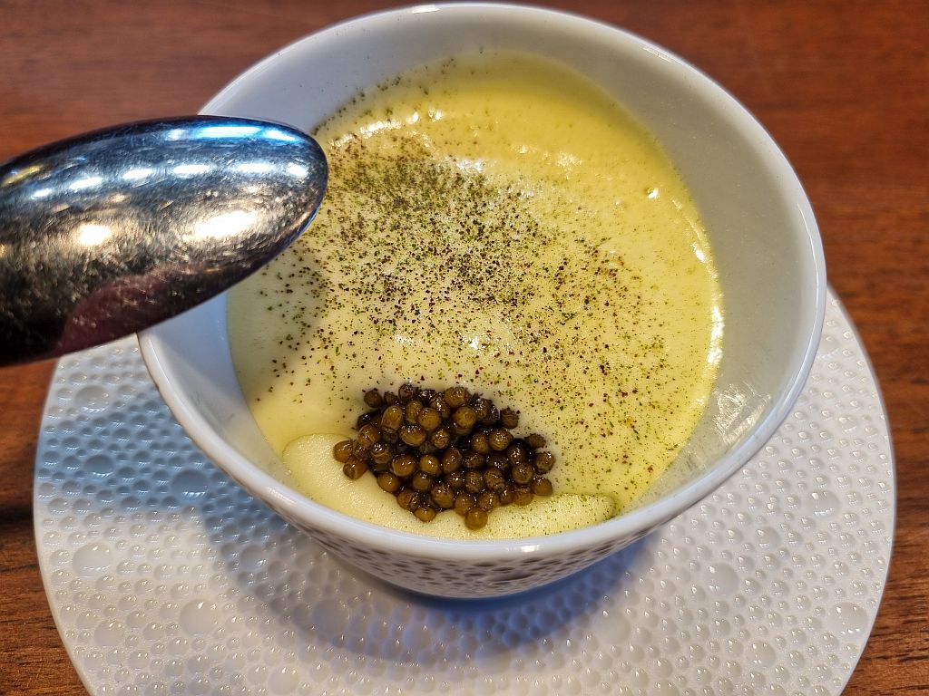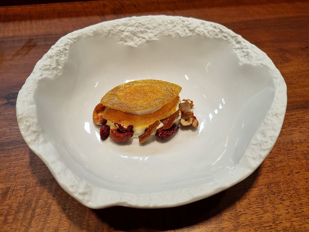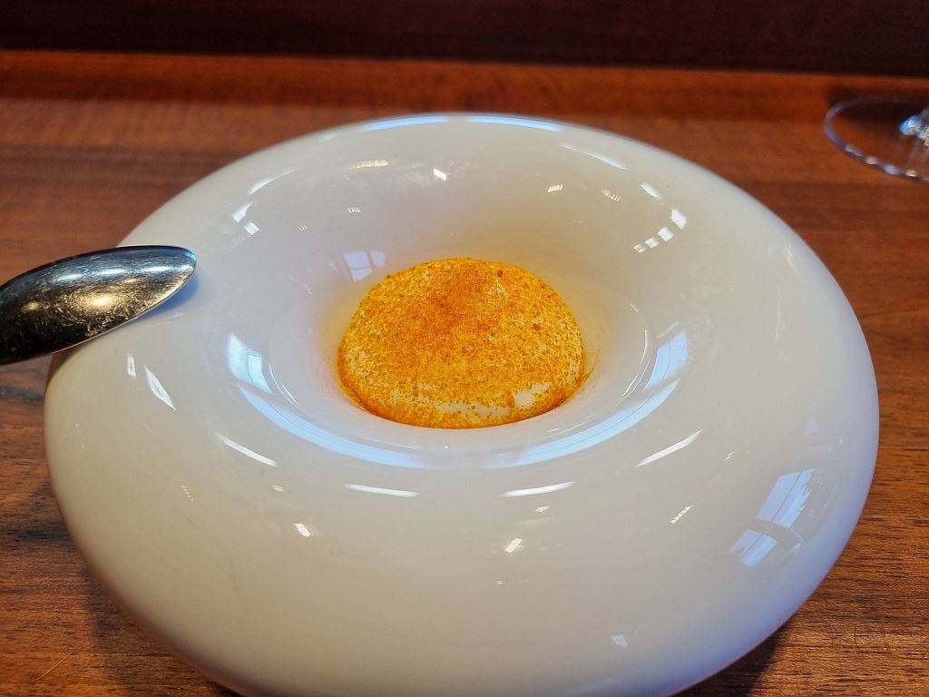 Der nächste Gruß war ein Käse-Schaum mit scharfen Gewürzen. Überraschend leicht und mit ein bisschen Gemüse unter dem Schaum – schlicht aussehend aber wir stehen ja weiterhin mit Espumas und unserem ISI Syphon auf Kriegsfuß.