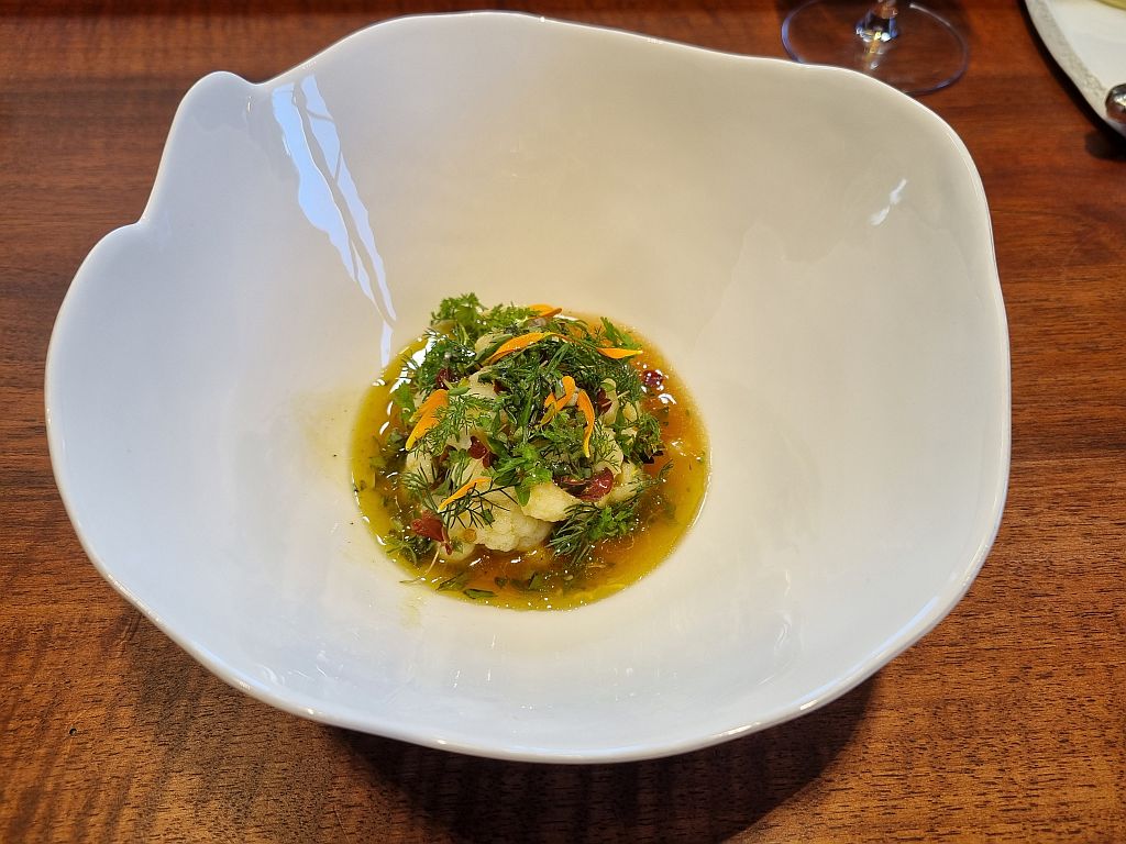 Der letzte Gruß war ein vegetarischer Gang: Blumenkohl, Tomaten und eine sagenhafte Vinaigrette. Der Blumenkohl war leicht fermentiert und durch die vielen Kräuter hatte das ganze einen recht wilde Charakter. Aber es passte, denn so waren wir gut auf den ersten Gang des Menüs vorbereitet.