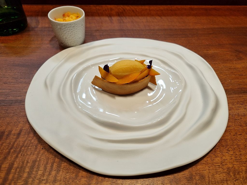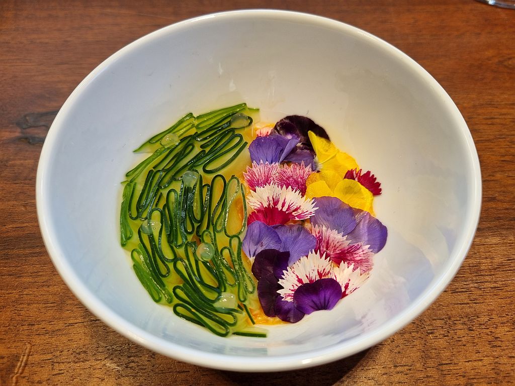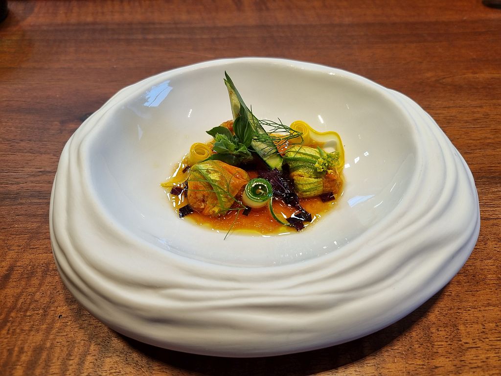 Vermutlich eher so als „Neutralisierungs“-Gang gedacht, aber trotzdem ein technisch sehr guter Gang, denn das Gemüse war knackig und nicht weich, die Zucchini-Blüten nicht zu Tode frittiert, sondern leicht angeröstet und insgesamt sehr rund in den Rest der Zutaten eingefügt.