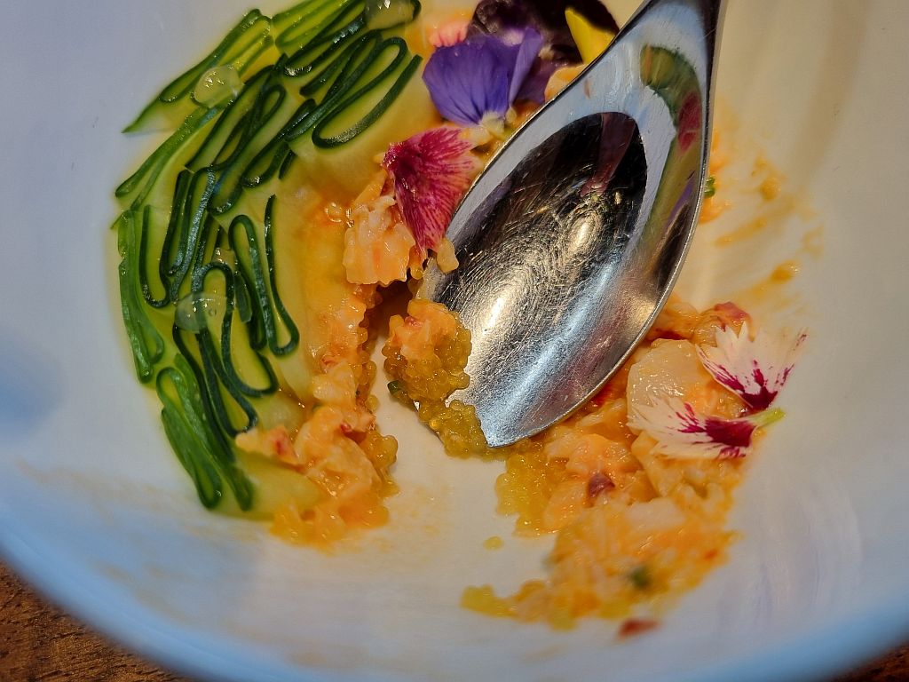 Glücklicherweise schmeckte es auch, der Hummer war sehr klein gehackt und passte so sehr gut zu der Größe der Kavier-Perlen. Bunt, lecker und doch kunstvoll.