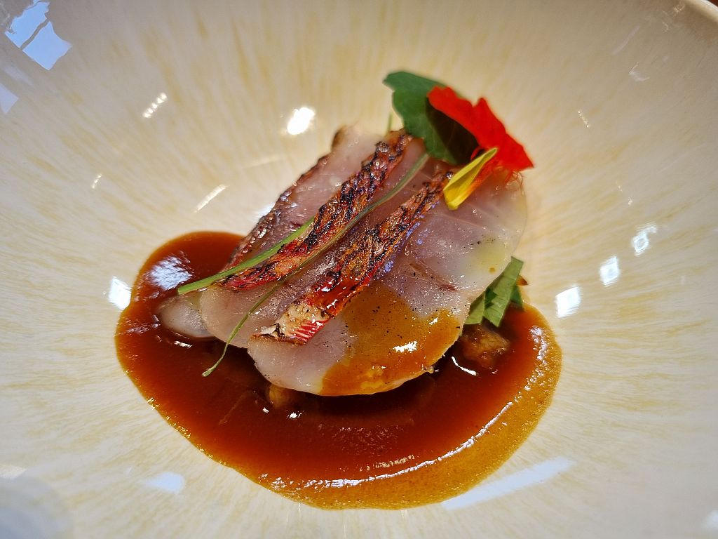 Rotbarbe, Bomba-Reis, Sauce. Und noch ein paar Blumen. So ungefähr wurde der nächste Gang angekündigt und ehrlich gesagt war dies der schwächste im 11 Gang Menü, denn die Rotbarbe war recht neutral, die Haut eher flabberig und die angegossene Bisque eher zu stark für die anderen Komponenten auf dem Teller.
