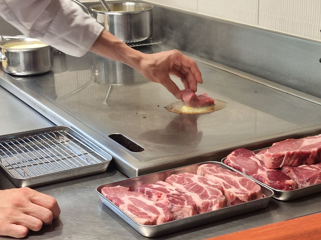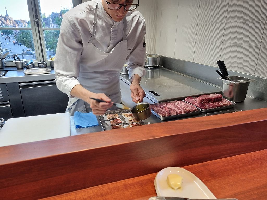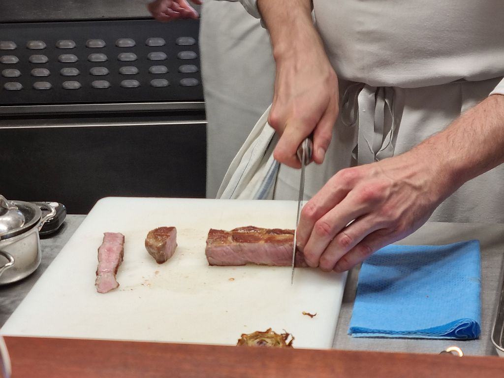 Während wir den ersten Fleischgang genossen, konnten wie die Vorbereitung auf den zweiten beobachten – für Unterhaltung war also gesorgt.