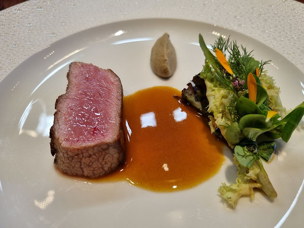 Der wurde im französischen Menu (natürlich) als „Hummer mit Gurke und Dahlien“ beschrieben. Was völlig ausreichend war, denn genau das war es. Gut, kleine Tupfen einer Zitruscreme, etwas Kaviar und eine schön kräftige Sauce waren auch noch dabei, aber das war es halt auch. Und es sah fantastisch aus!