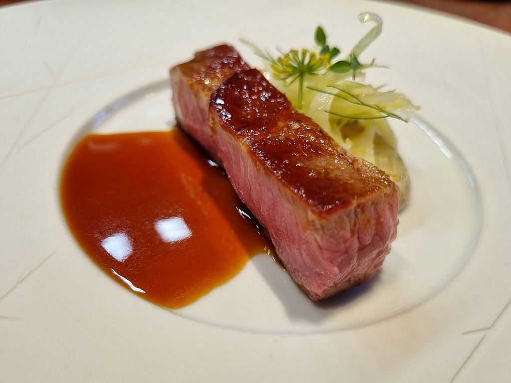 Recht hatten sie, denn „Le caviar de la Maison Nordique, pomme de terre“ war eine Götterspeise. Endlich mal wieder ein Gang, wo der Kaviar als Würzungsmittel eingesetzt wurde, die verschiedenen Texturen der Sauce und der Kartoffel fügten sich zu einem sagenhaften Gesamtbild, sodass man einfach nur den Löffel voll machte und genoss.