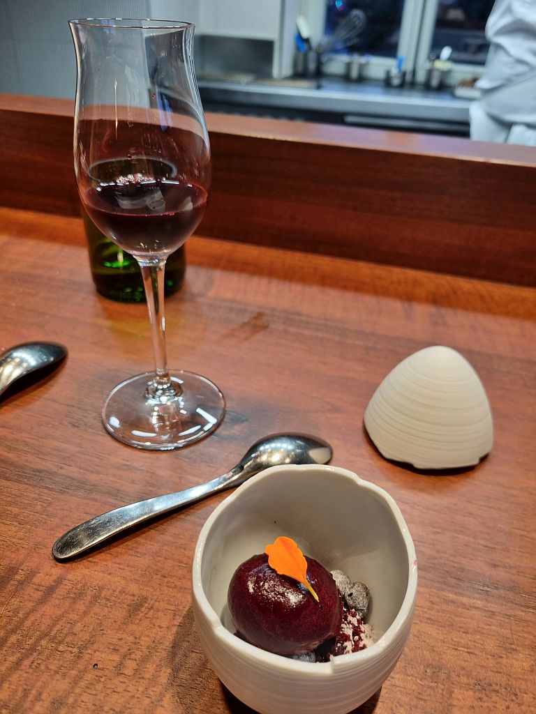 Wir fühlten uns einfach wohl, obwohl die Taktung der Gänge eher als „nordisch“ bezeichnet werden konnte – die Teller kamen schnell und einmal sogar vor dem Wein. Das wurde aber direkt am Pass bemerkt (den hatten wir ja im Blick) und beim nächsten Gang wurde dann auch nachgefragt, wann der Wein kommt. Und dann kam das Essen beim letzten Satz des Somelliers.