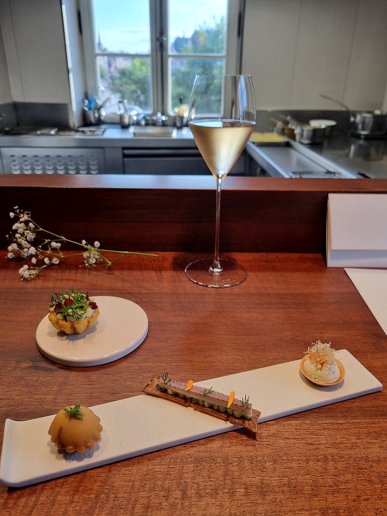 Am Erinnerungswürdigsten (gibt es das Wort überhaupt?) war das warme Küchlein hinten, was sehr floral garniert und mit einer wunderbaren Creme gefüllt war. Aber auch der Aal in der Mitte war super lecker und die Art Pommes souflées unten links hatten eine echt schöne Textur. Ach, am Ende war alles lecker und machte genau das, was ein Gruß aus der Küche machen soll: Appetit anregen und Vorfreude steigern.
