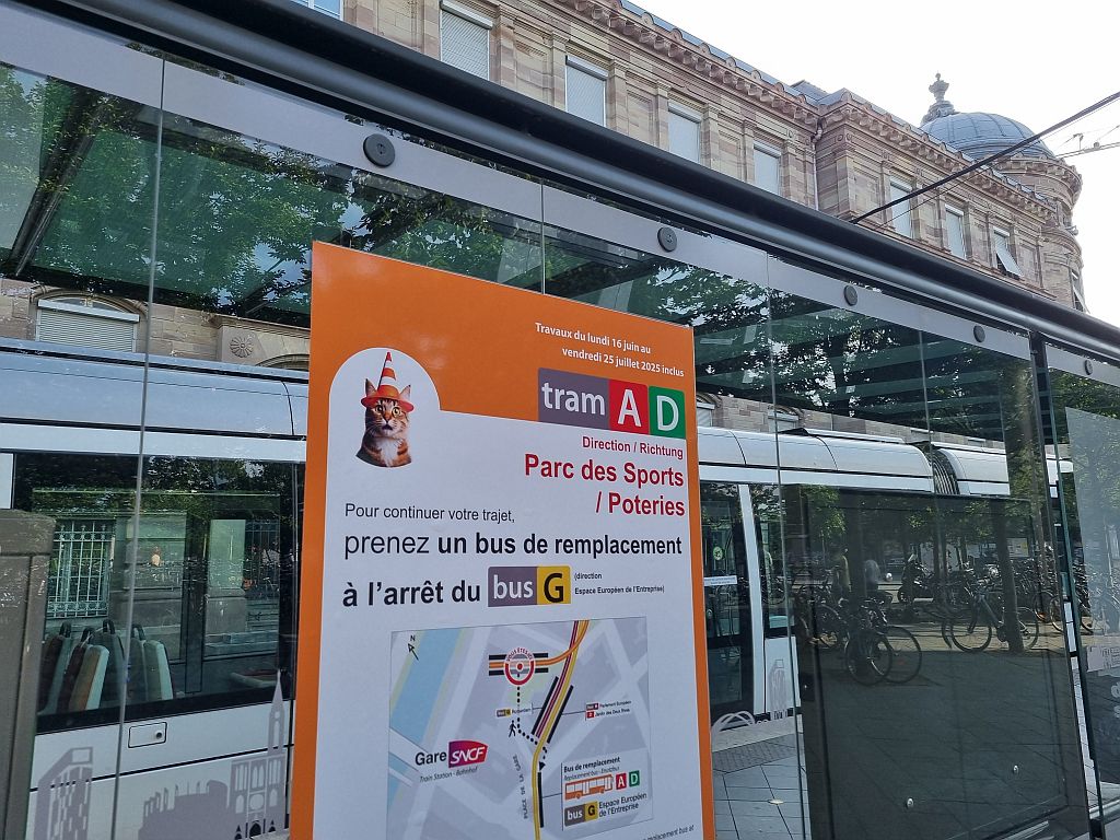 Wie man auf eine Katze mit einer Pylone auf dem Kopf als Symbol für „Hier ist eine Baustelle“ kommen kann, bleibt auch ein Geheimnis der hiesigen Verkehrsbetriebe.