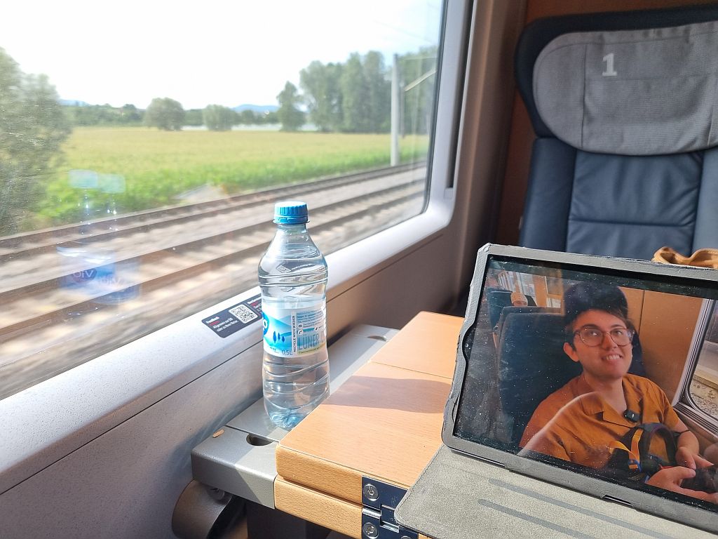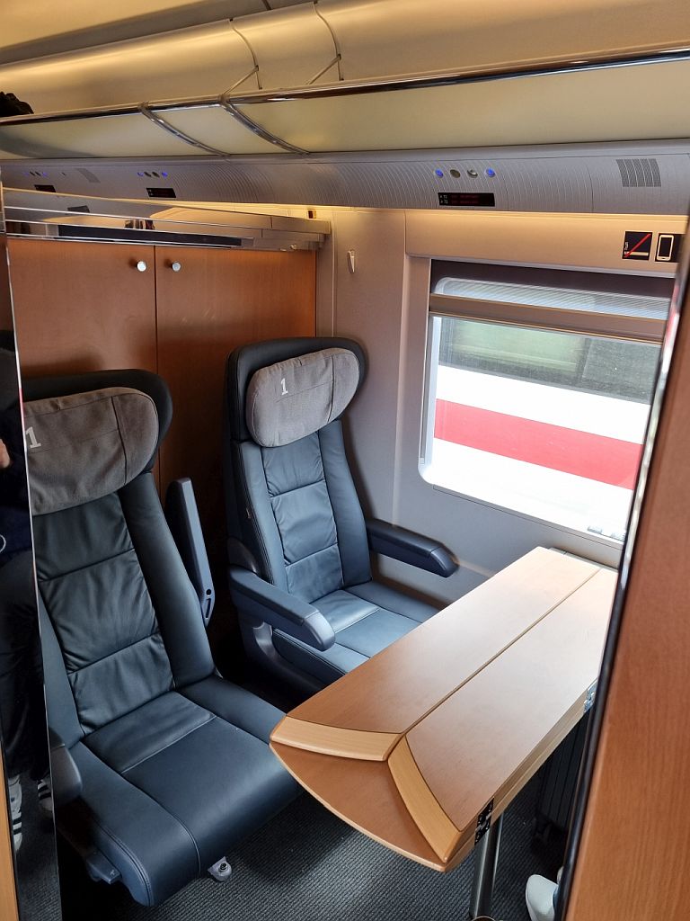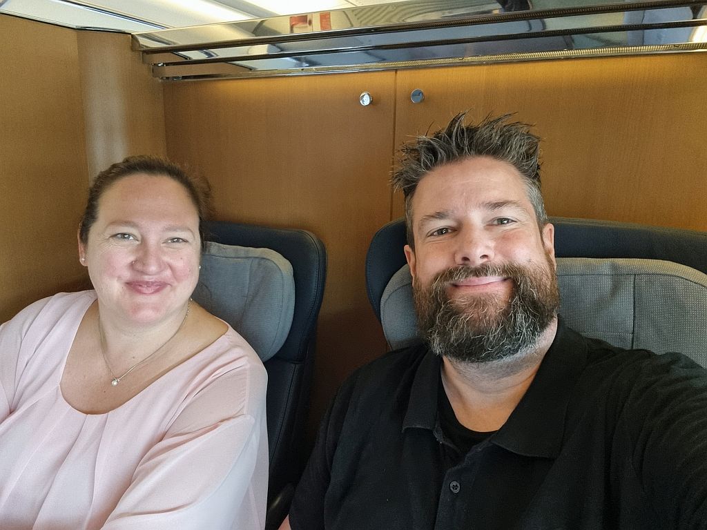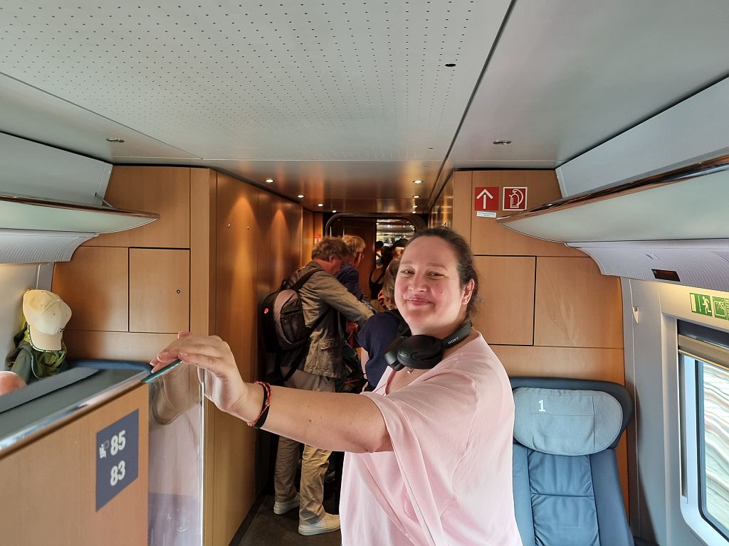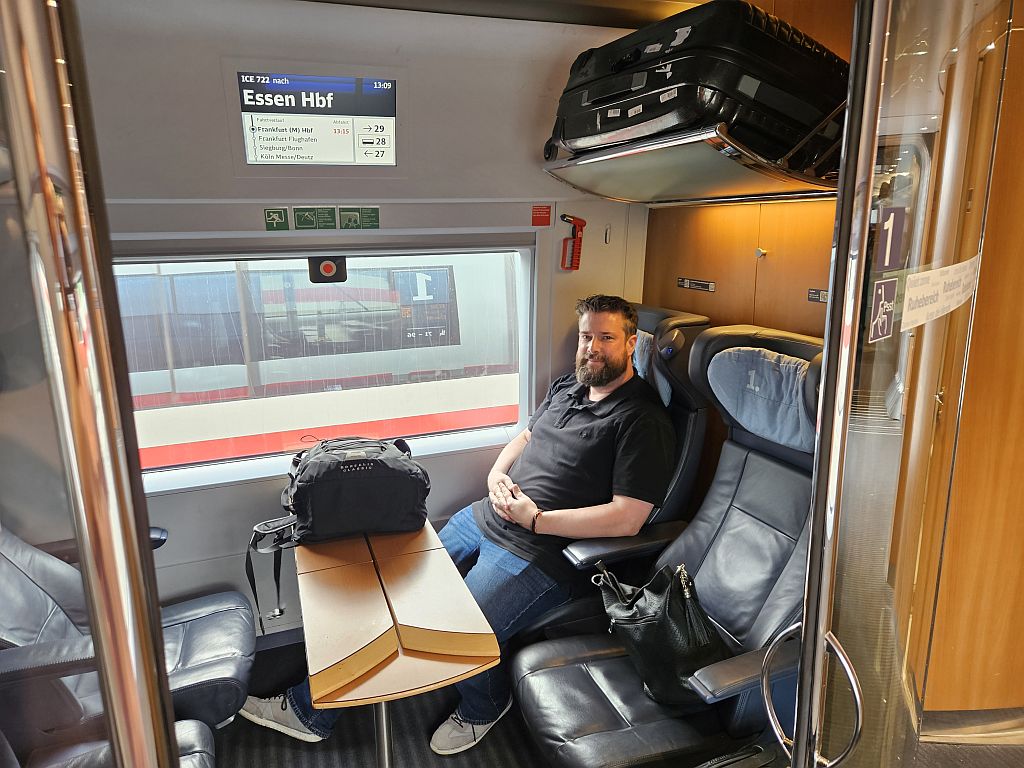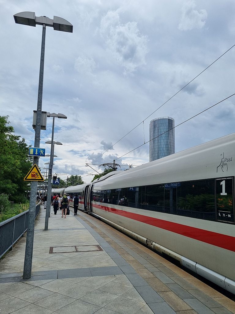 Pünktlich kam unser ICE aus Konstanz an und wir richteten uns ein. Für die Strecke von Offenburg nach Frankfurt Hauptbahnhof hatten wir uns in einen dieser kleinen Abteile im ICE 3 gesetzt. Angenehm, weil man da viel Ruhe hat. Unangenehm, weil man direkt neben der Toilette sitzt und die recht deutlich hört.