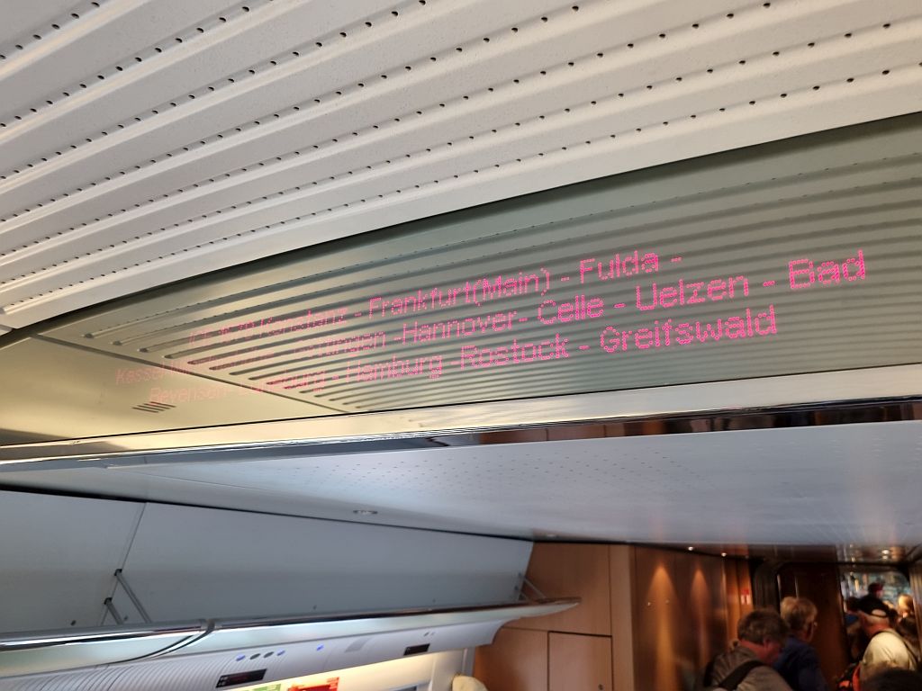 Der ICE 1578 ist übrigens etwas besonders, denn er führt einmal quer durch Deutschland. Wortwörtlich, denn es geht um 7:46 Uhr in Konstanz los und über viele, viele Halte bis an die Ostsee nach Greifswald, wo er laut Fahrplan um 20:52 Uhr ankommen soll. Wenn er fährt, dann ist der Zug auch relativ pünktlich, was aber auch daran liegt, dass er über ein paar Nebenstrecken fährt. Weswegen man in den Genuss von Halten in Bruchsal, Wiesloch-Walldorf oder Weinheim an der Bergstraße kommt.