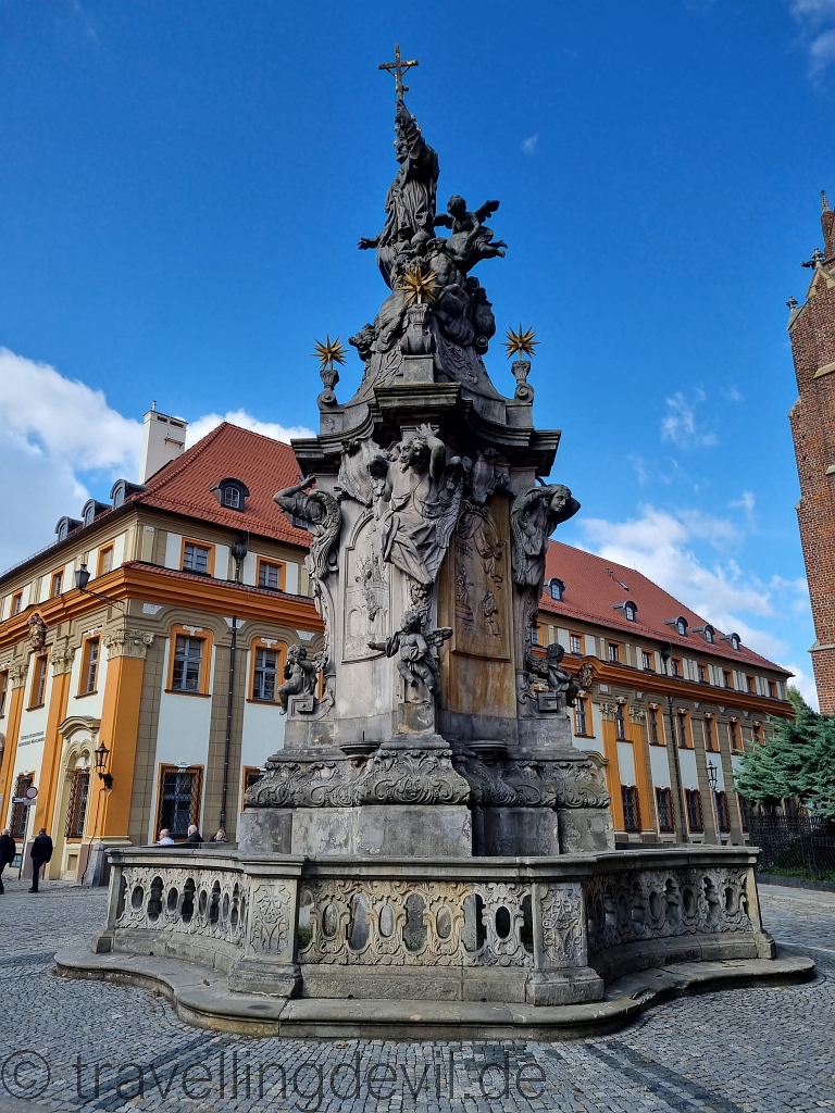 Die Statue wurde zwischen 1730 und 1732 vom böhmisch-deutschen Bildhauer Johann Georg Urbansky erbaut. Wenn man genauer hinschaut, sieht man aber ein etwas eigenartiges Detail an diesem Denkmal: Zwei der Cherubim, die die Figur schmücken, sind kahlköpfig dargestellt, im Gegensatz zur typischen Darstellung von Cherubim mit vollem (vermutlich goldenem) Lockenhaar. Diese skurrile Note birgt eine liebenswerte Geschichte. Es heißt, dass Urbanskys Assistent, der mit der Fertigstellung der Cherubimköpfe beauftragt war, von der Geburt seines haarlosen Sohnes inspiriert wurde. Um diesen besonderen Anlass zu feiern, beschloss er, das Abbild seines Babys inmitten des himmlischen Engelschors zu verewigen. Obwohl sein Chef zunächst verärgert war, gewann die kühne Tat des Bildhauers schließlich Urbanskys Herz, sodass er einem zweiten Cherub ebenfalls einen Bürstenschnitt verpasste, um die Symmetrie zu wahren.