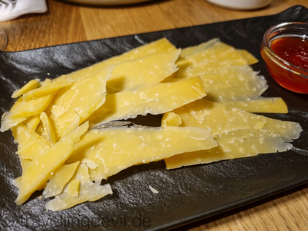 Und hier entdeckte Meike ihre käsige Seite, denn der polnische Bernsteinkäse, Bursztyn genannt, hatte es ihr sehr, sehr angetan. Dieser ist ein Hartkäse aus Polen nach dem Vorbild italienischer Hartkäse wie Grana Padano oder Parmigiano Reggiano. Bursztyn wird in der Genossenschaftsmolkerei Spomlek in Radzyń Podlaski im Osten Polens hergestellt. Und schmeckt sehr lecker. So lecker, dass wir noch eine Portion nachorderten.