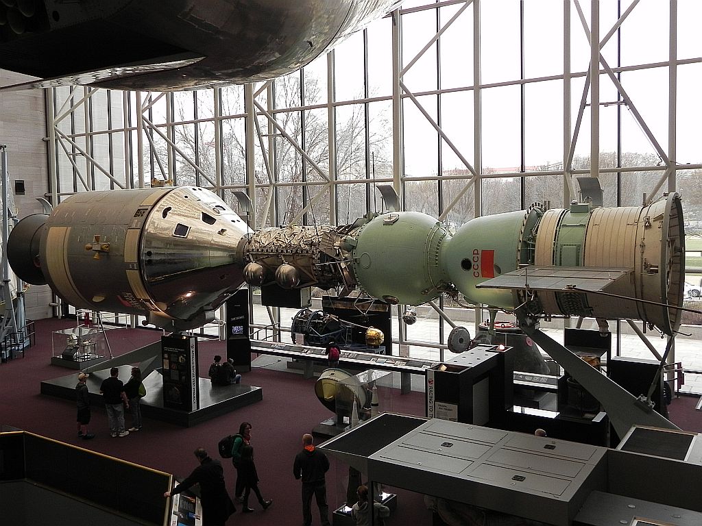 Hier eine Apollo und eine Sojus Kapsel, die am 17. Juli 1975 in der Erdumlaufbahn aneinander ankoppelten, so dass die Raumfahrer von einem Raumschiff ins andere umsteigen konnten. Die Mission in einer Hochphase des kalten Krieges war ein sehr pazifistisches Signal in einer Zeit, in der der Weltraum als Spielball im Wettrüsten genutzt wurde.