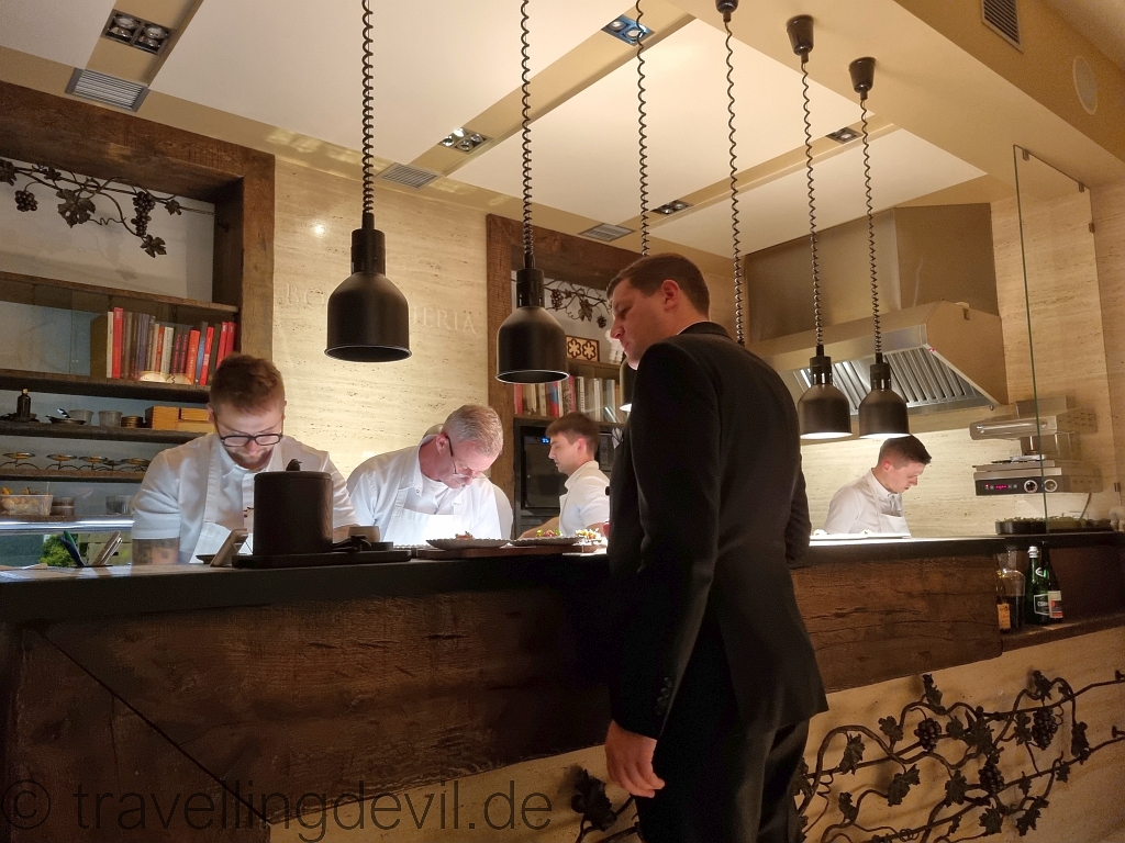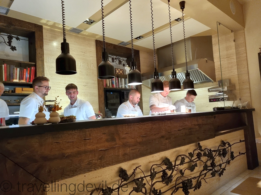 Das Restaurant wurde vom Guide mit zwei Sternen ausgezeichnet und beispielsweise vom Falstaff mit 96 von 100 möglichen Punkten. Chef Przemyslaw Klima fährt hier ein Konzept aus klassischen polnischen Gerichten, die er, dort wo es möglich ist, modern interpretiert und zeitgemäß präsentiert. Nach einem herzlichen Empfang wurden wir damit überrascht, dass wir an den Chefs Table gesetzt wurden und somit einen Blick auf den Pass und Teile der Küche hatten. Mittendrin statt nur dabei, wie es ein ehemaliger Sport-TV-Sender mal als Slogen hatte.